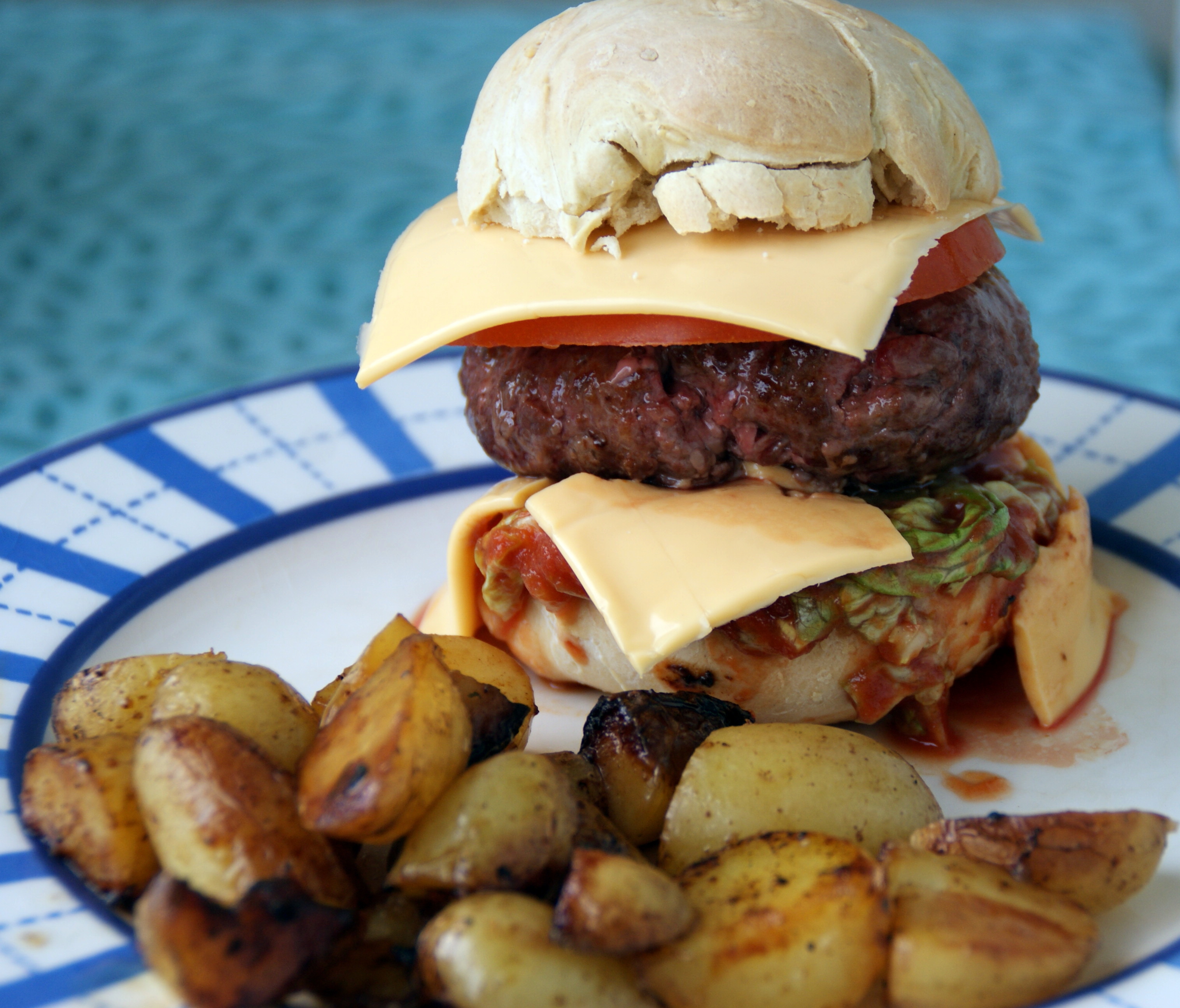 Now, you’ve got your burgers, your baby potatoes. Everything is perfect.