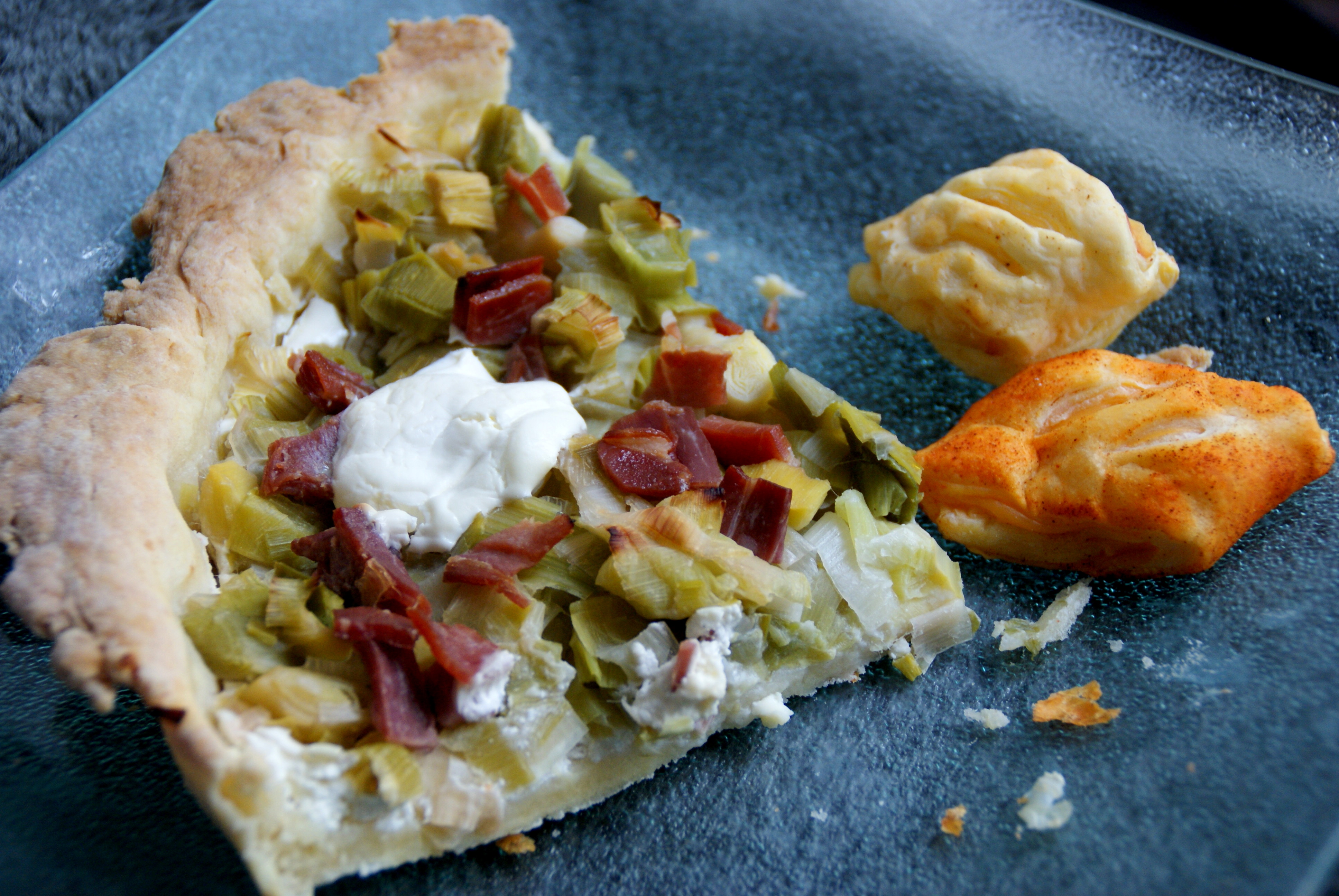 Pour la garniture: 30cl de crème fraîche liquide, un bol de poireaux coupés et bouillis et un eu de lardons pour décorer le dessus.