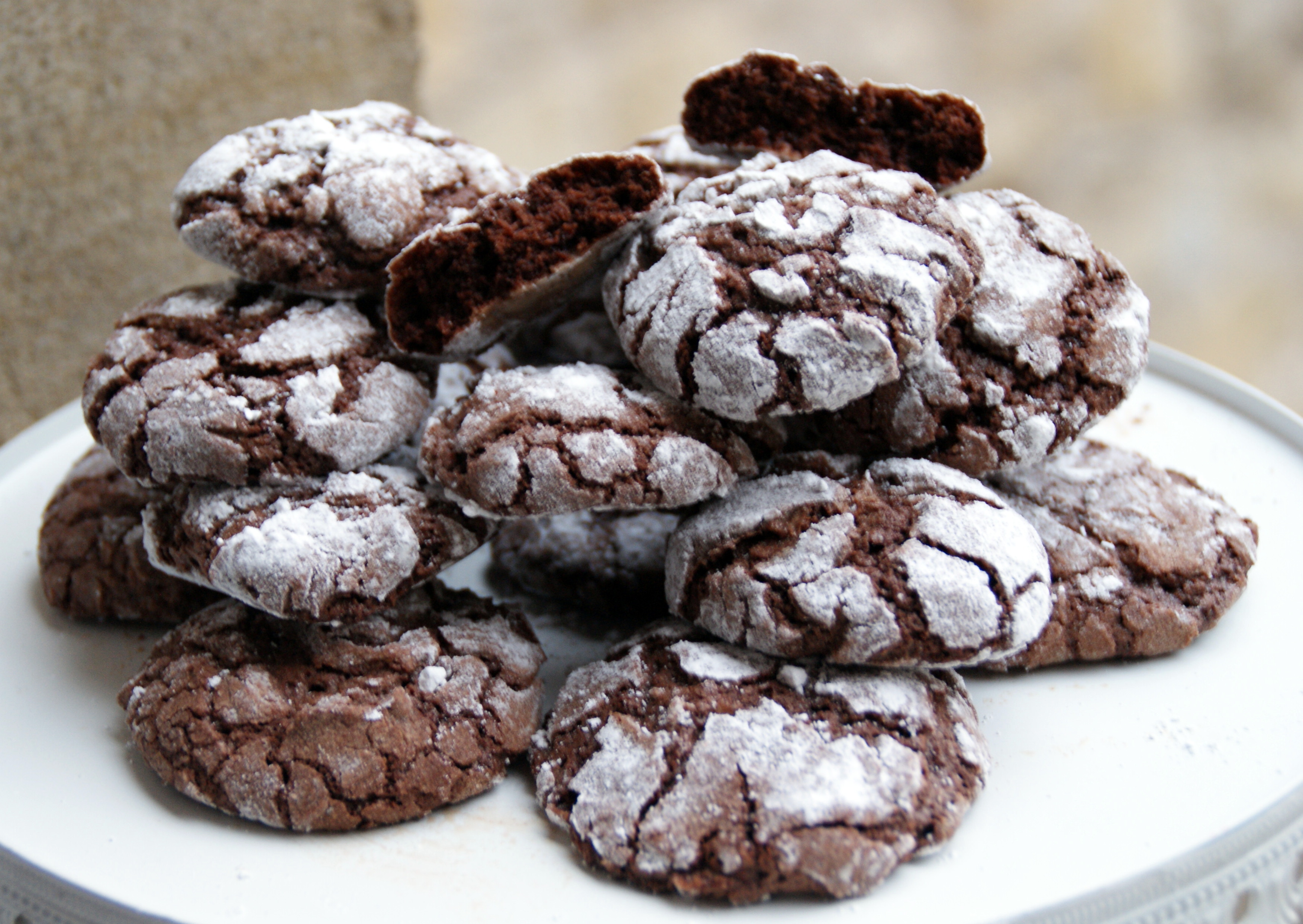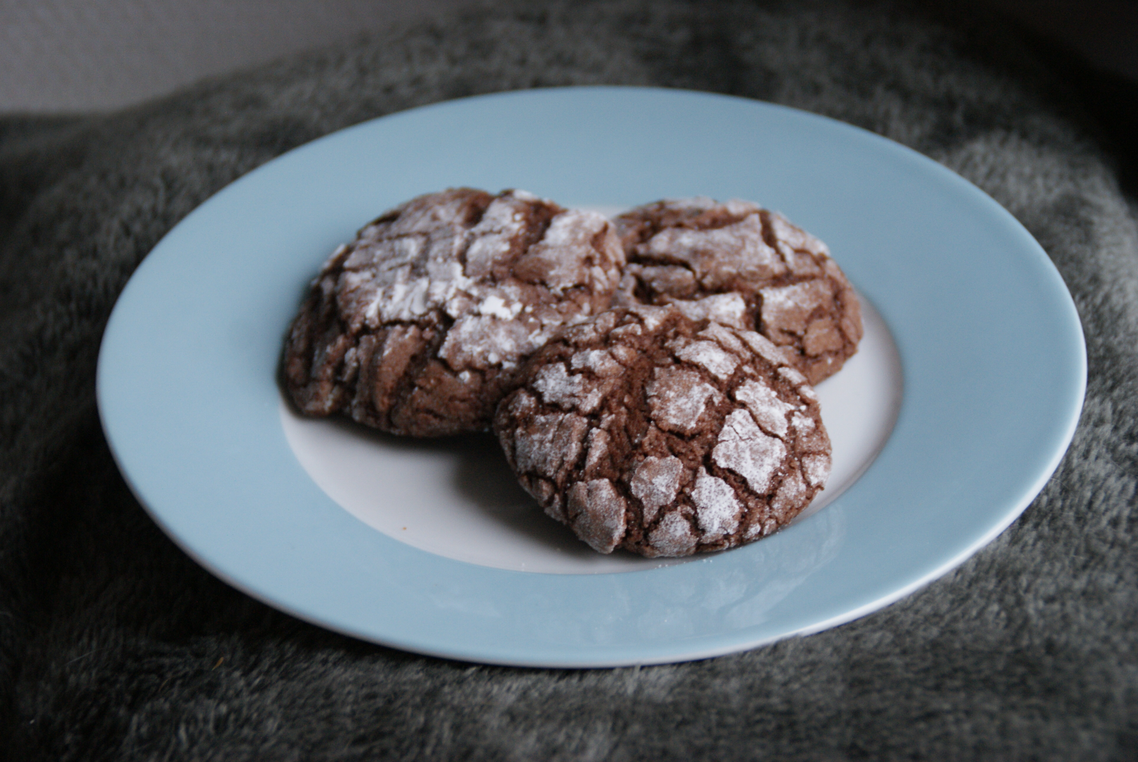 Pour 30 biscuits: 115g de chocolat noir finement haché, 90g de farine, 25g de cacao non sucré en poudre, 1 cuillerée à café de levure chimique, une mini pincée de gros sel, 60g de beurre à température ambiante, 150g de sucre roux, 1 oeuf de préférence gros, 1/2 cuillerée à café d’extrait naturel de vanille, 40ml de lait entier, 100g de sucre en poudre, 60g de sucre glace.
