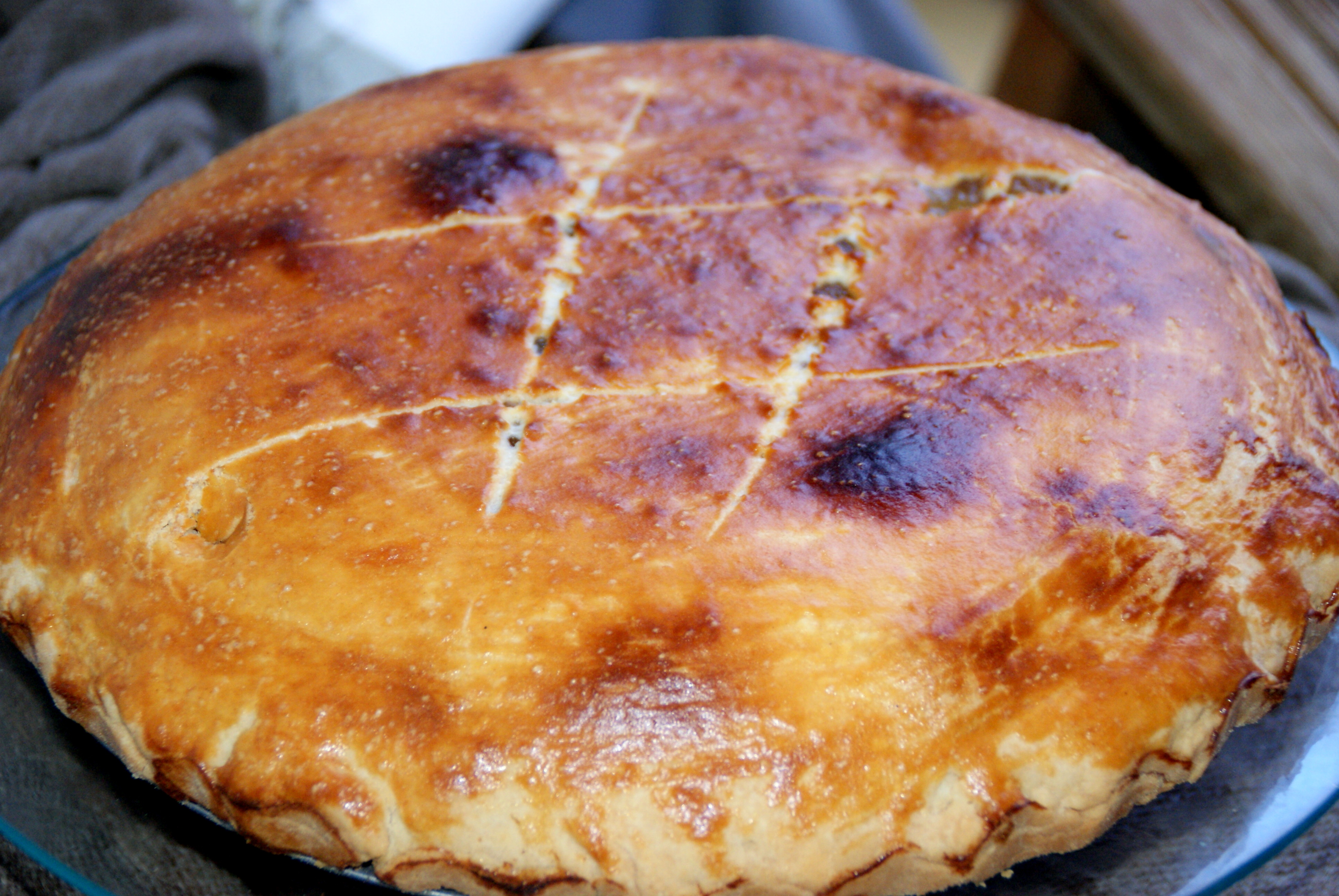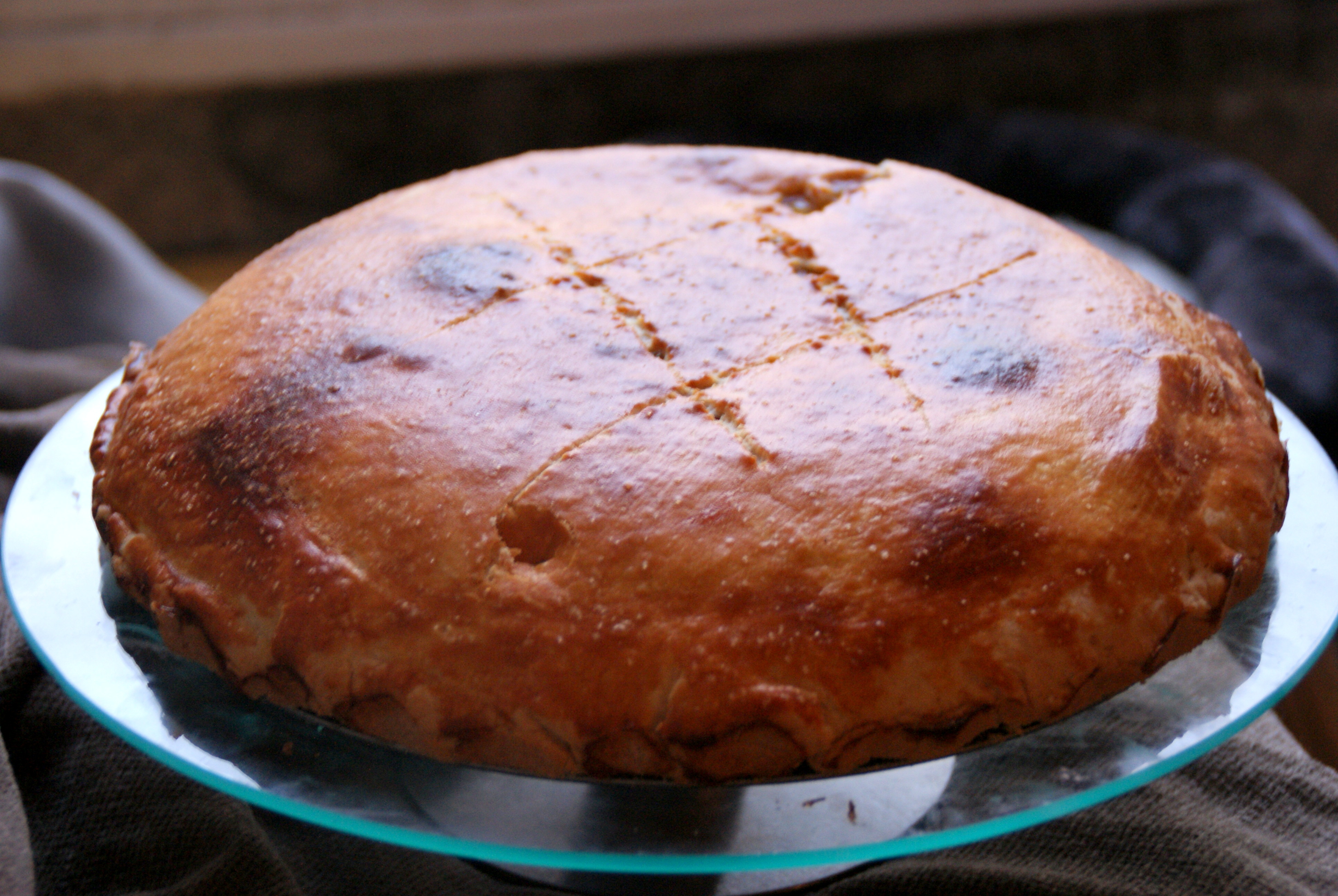 La cuisson: Enfournez pour 15mn. Ôtez le papier avec les haricots/riz et remettez au four pendant environ 5mn. Versez la garniture sur la pâte. Couvrez avec le deuxième disque de pâte, soudez les bords en les pinçant avec les doigts et faites de petites incisions sur le dessus pour laisser respirer la tourte. Badigeonnez la pâte du mélange de jaune d’oeuf et d’eau à l’aide d’un pinceau, puis parsemez de cassonade. Enfournez et laissez cuire pendant environ 45mn. Laissez refroidir 2h avant de couper. Servez chaud avec une boule de crème glacée, froid avec de la crème Chantilly ou même juste comme ça.