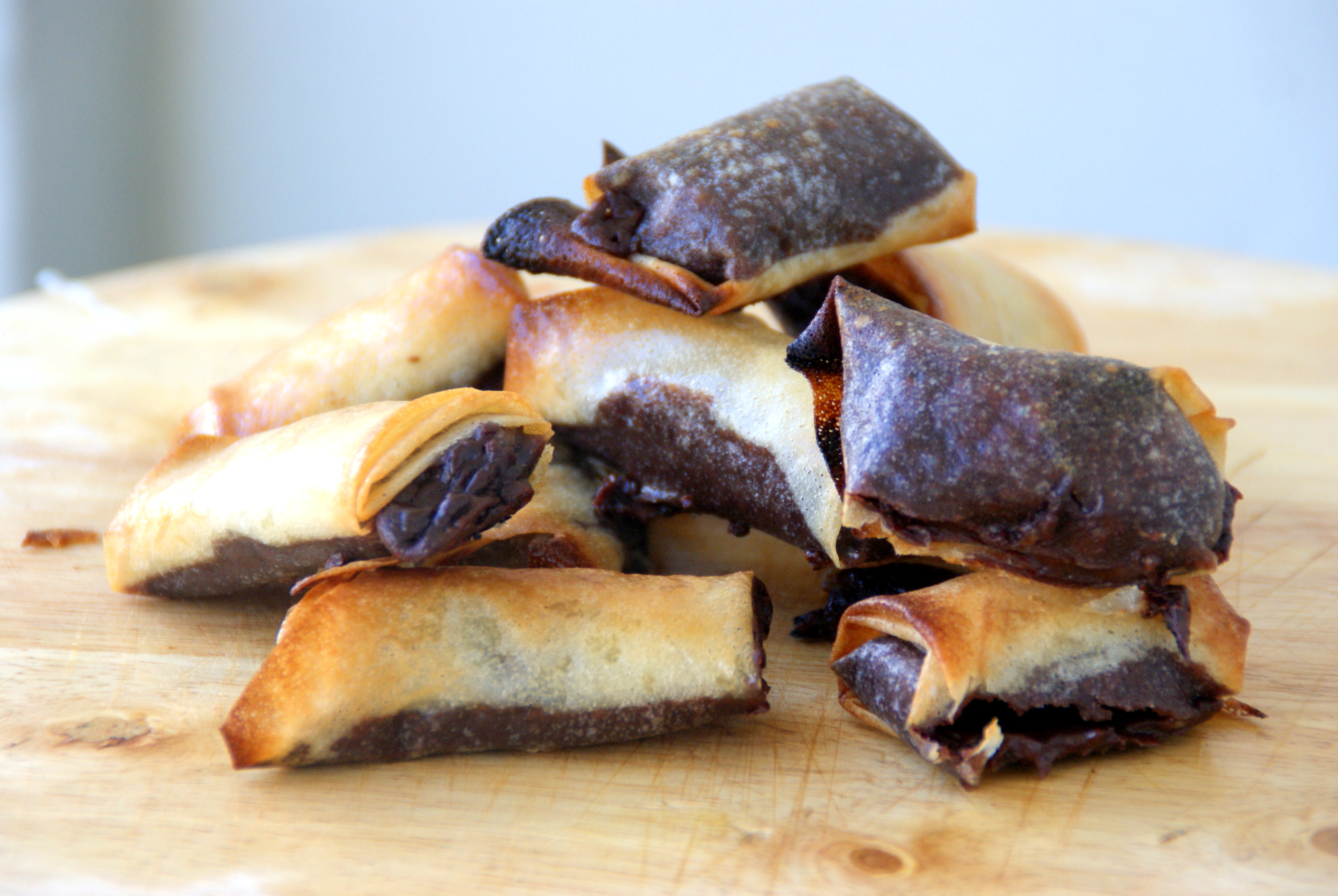 Je reprends petit à petit mon service ici et en plus je cherche même à me perfectionner en lisant des magazines sur wordpress, si c’est pas beau ça! Bref, on est déjà bientôt en mai, je pars en week-end surprise avec ma soeur ce week-end et vu le temps qu’il fait ici j’ai super peur pour le temps qu’il va faire là-bas… J’espère que chez vous c’est mieux que chez moi parce que c’est vraiment moche et ça donne juste envie de filer sous la couette et dormir ^^ Vous avez pas la grippe quand même, hein? =) Pour vous réconforter quoi de mieux que du chocolat? Evidemment, rien alors aujourd’hui c’est nems au chocolat et yumyum! Comme pour la recette de dimanche, prévoyez quand même du temps parce qu’il faut 2 heures de congélation et 1 jolie heure entre préparation et cuisson.