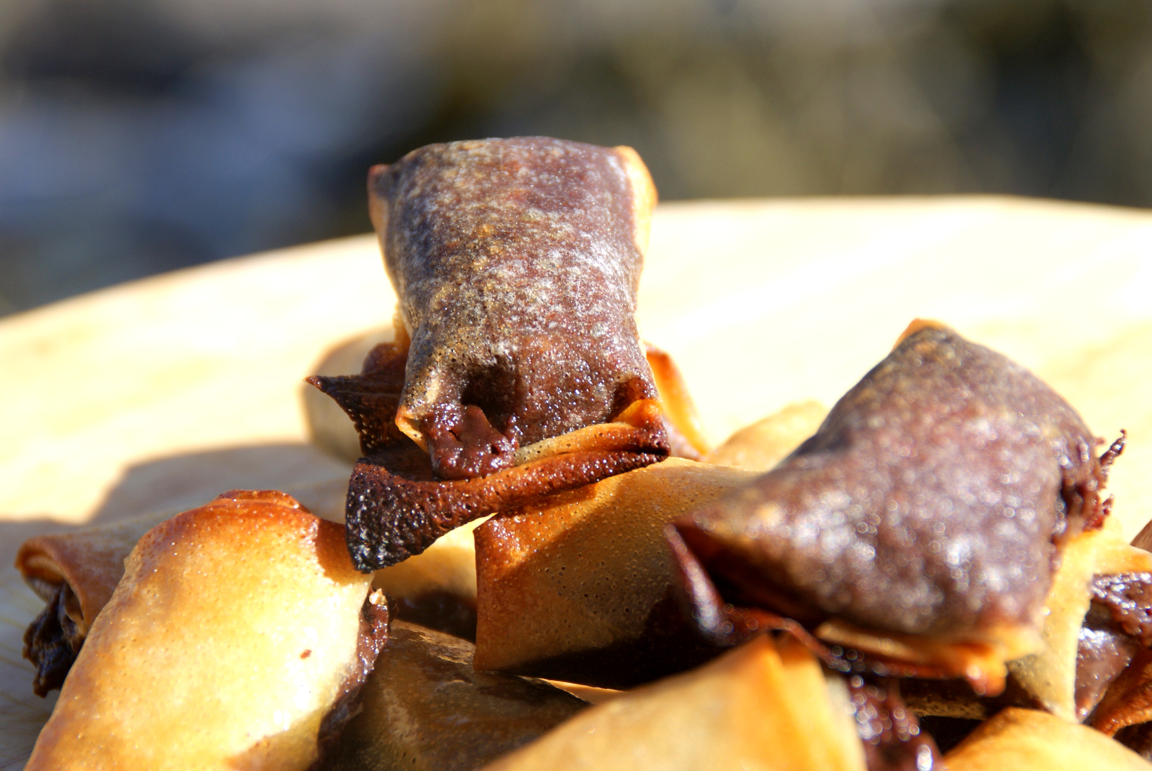 Il vous faut: 180g de lait, 1 zeste d’orange, 2 jaunes d’oeuf, 3 feuilles de Brick, 40g de sucre, 15g de farine, beurre fondu, 70g de chocolat noir.