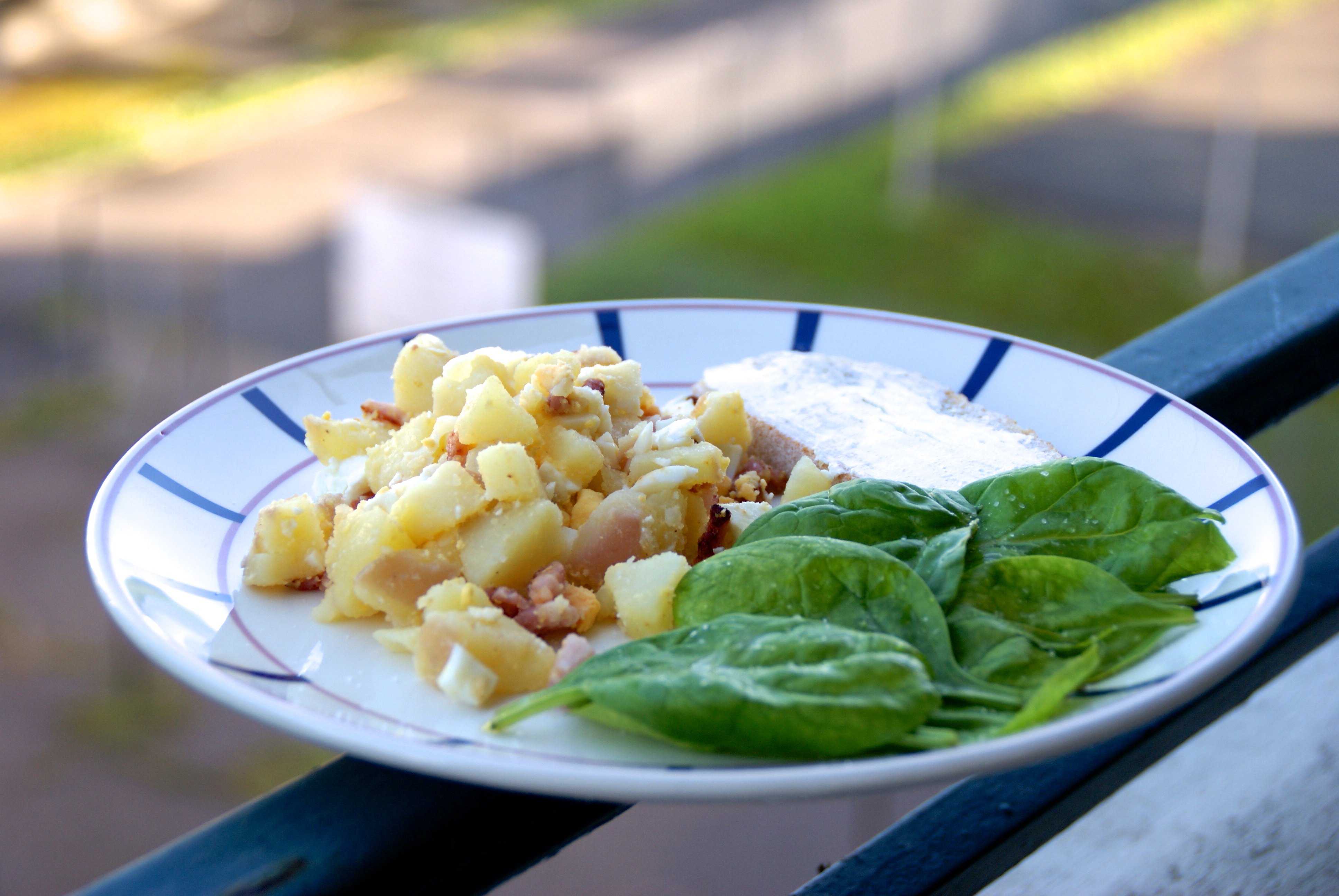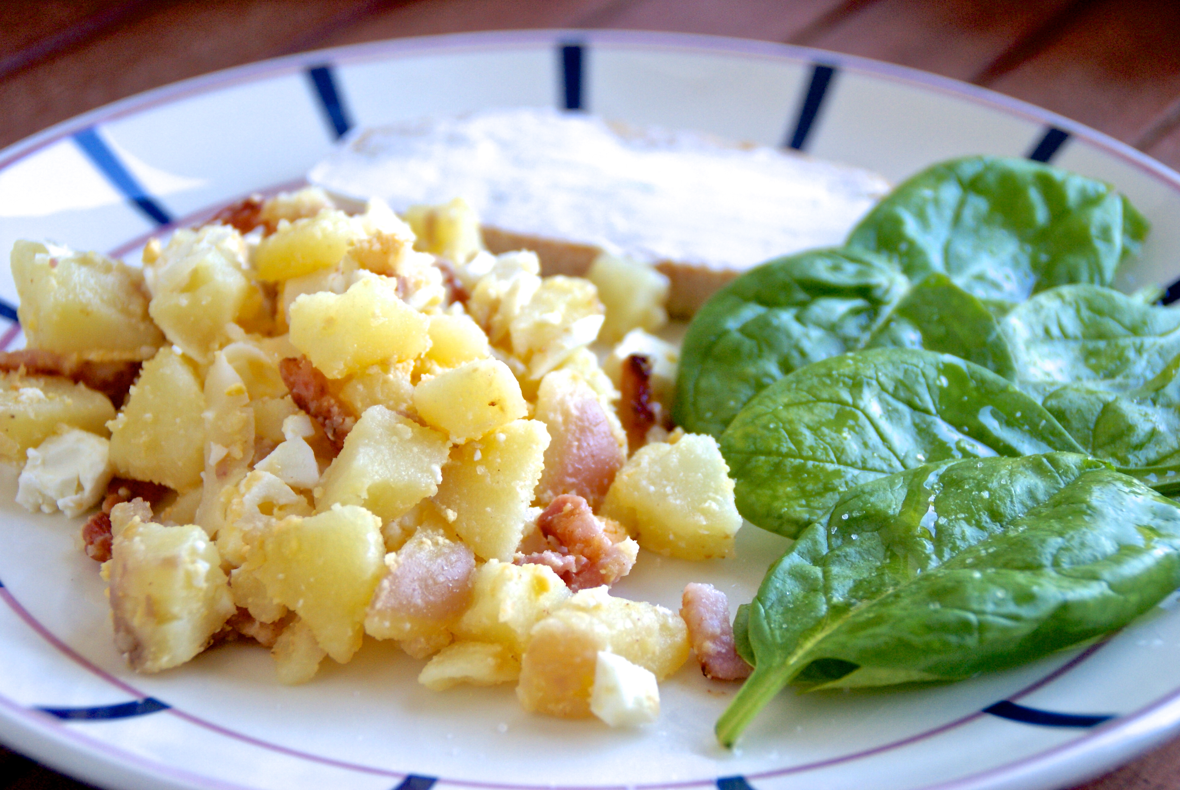 Pour 2 personnes gourmandes: 6 petites jolies patates roses, 1 barquette de lardons, 50g de fêta, de l’emmental que vous éplucherez, 3 oeufs durs. Un sachet de pousse d’épinards. Pour l’assaisonement, juste du sel et d’huile d’olive, restons dans la simplicité et pour accompagner une délicieuse tartine de Philadelphia nature.
