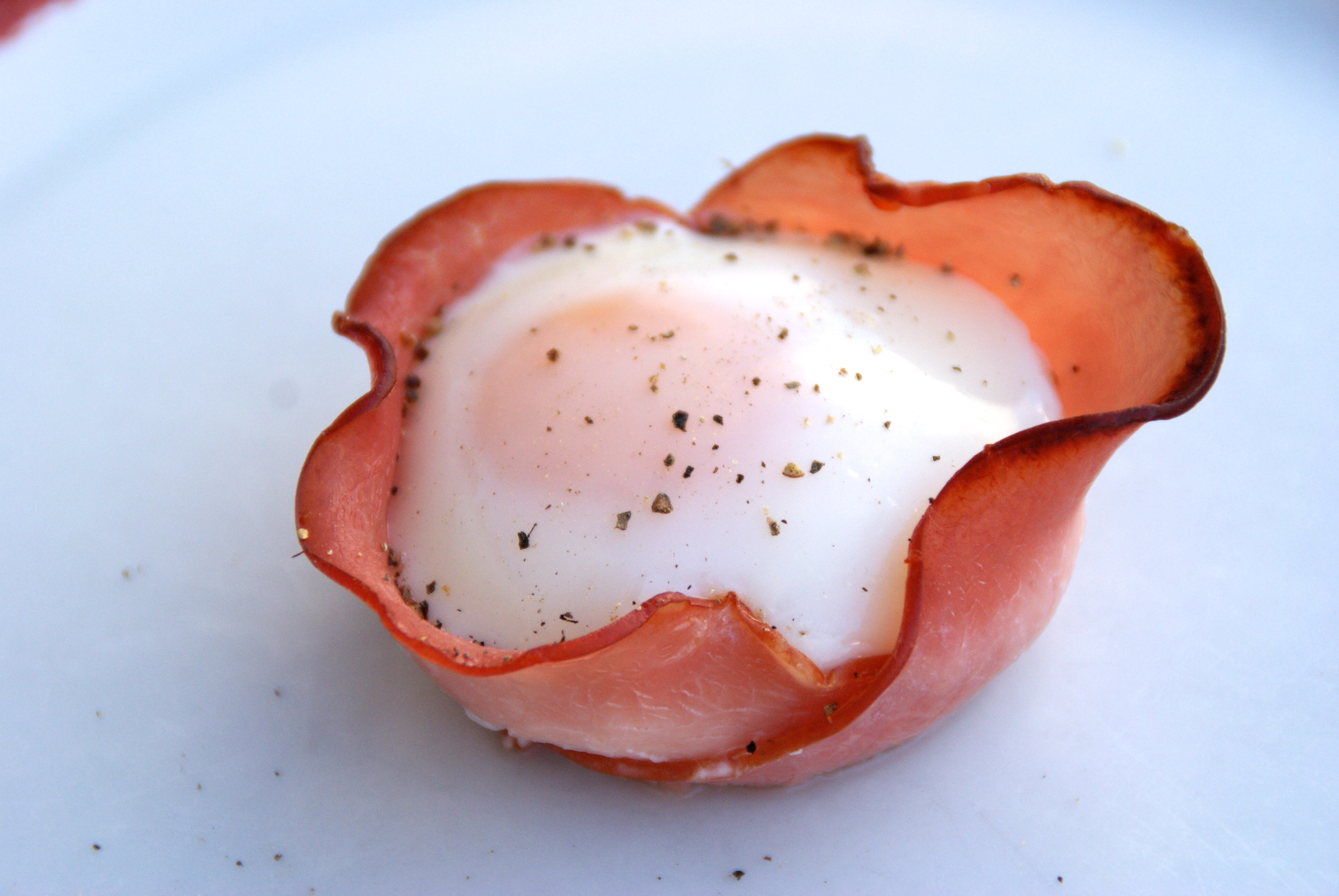 SONY DSCPar fleur: 2 tranches de bacon, 1 oeuf, du poivre, des herbes ou ce que vous voulez pour parfumer. Vous pouvez compter 2 oeufs par personne.