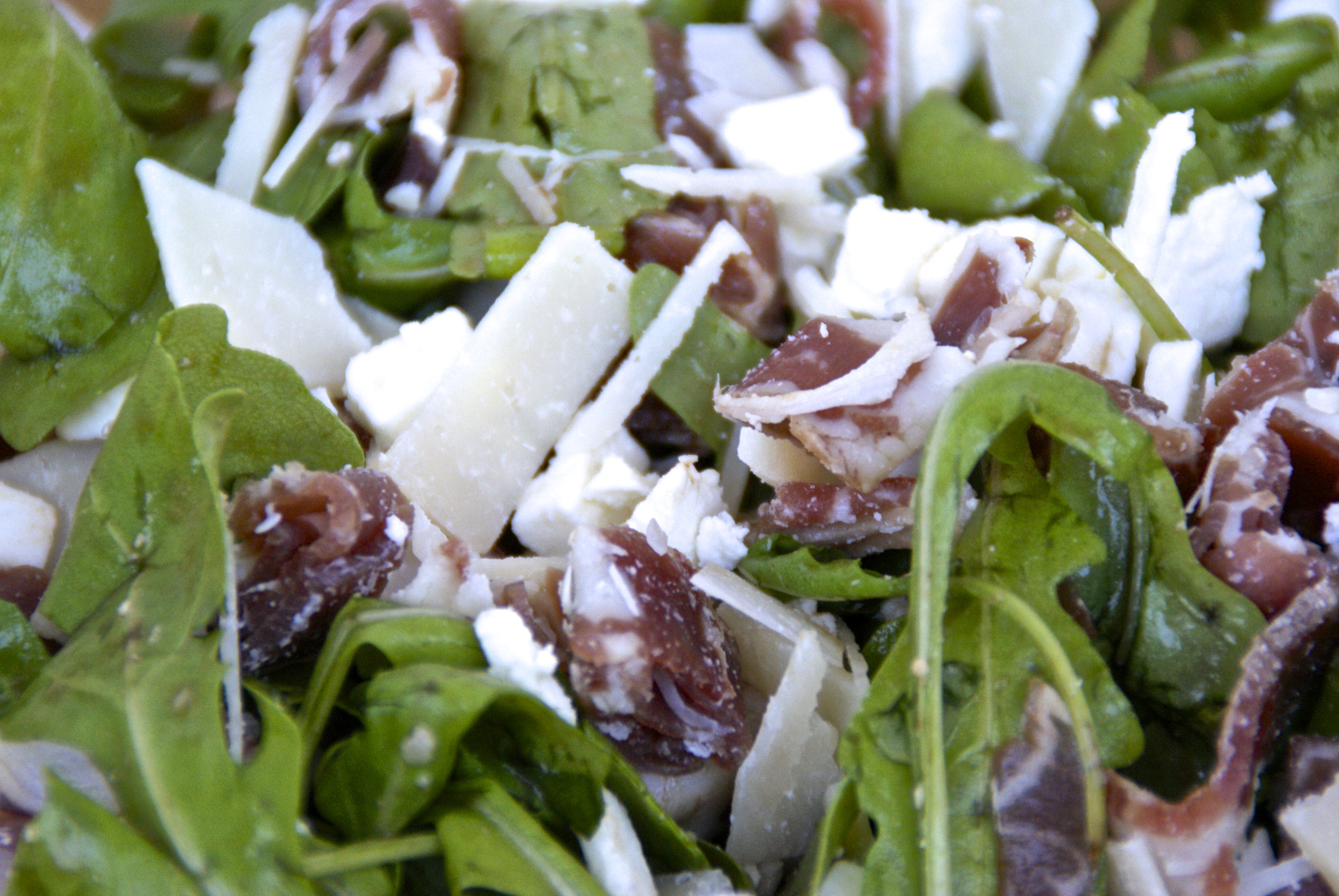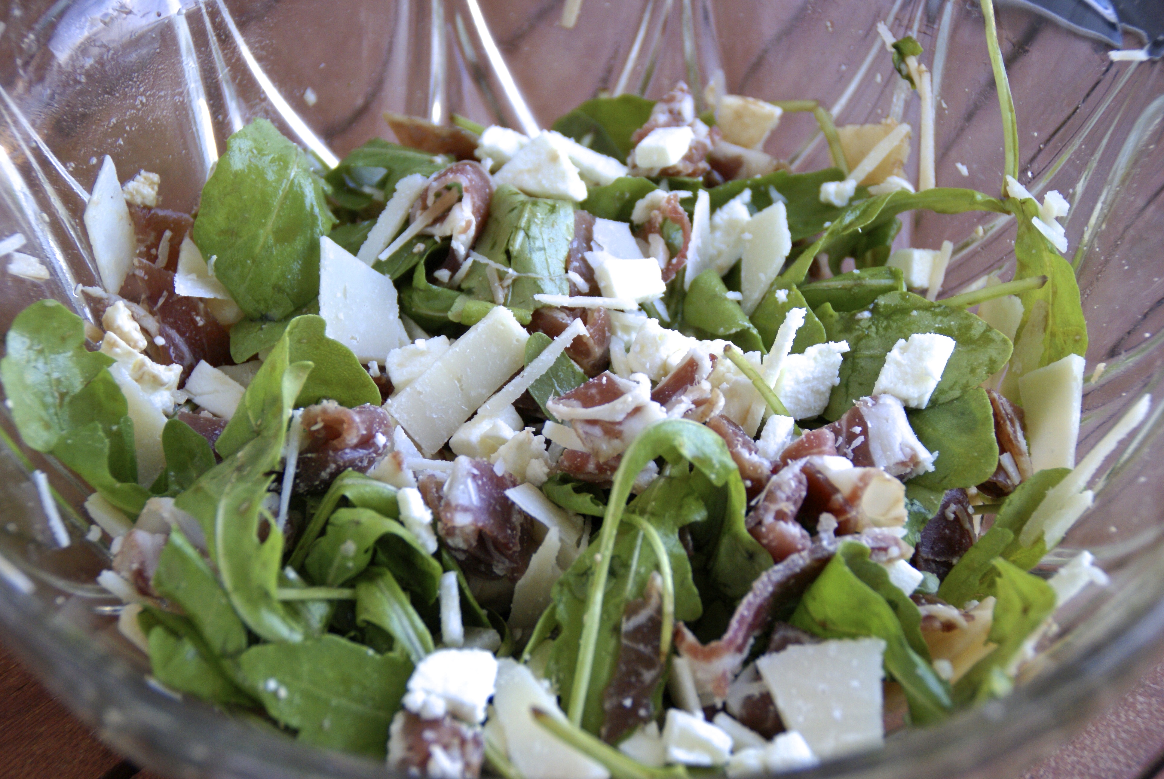 C’est une salade, c’est simple; mettez la roquette dans le saladier, coupez la pancetta en petit dès tout comme la feta. Pour le parsean épluchez-le (j’aime bien éplucher du fromage, c’est mon truc vous voyez), faites-en de fines lanières avec un économe quoi. Mélangez le tout et pour finir ajoutez un joli filet de vinaigre balsamique, si vous êtes des foufous vous pouvez aussi ajouter un filet d’huile d’olive.