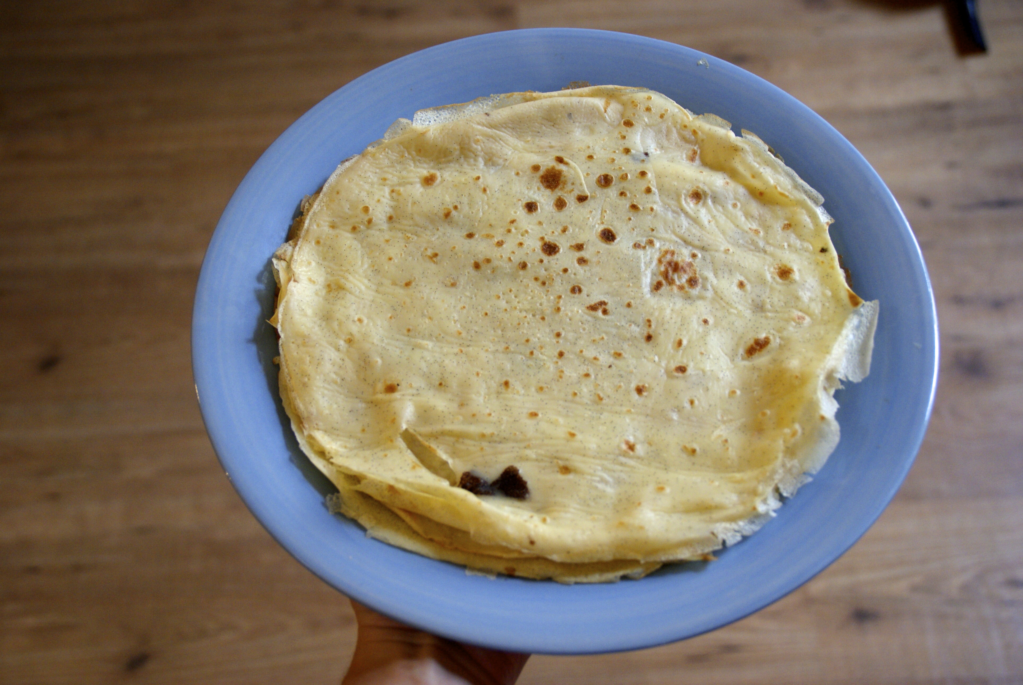 J’ai fait 10 crêpes dans une plutôt grande poêle avec: 130g de farine, 3 oeufs, 1 citron (bio de préférence), 10g de sucre vanillé (que je vous conseille de faire vous même), 25cl de lait, du beurre et des choses pour garnir (sucre glace, confiture, pâte à tartiner…)
