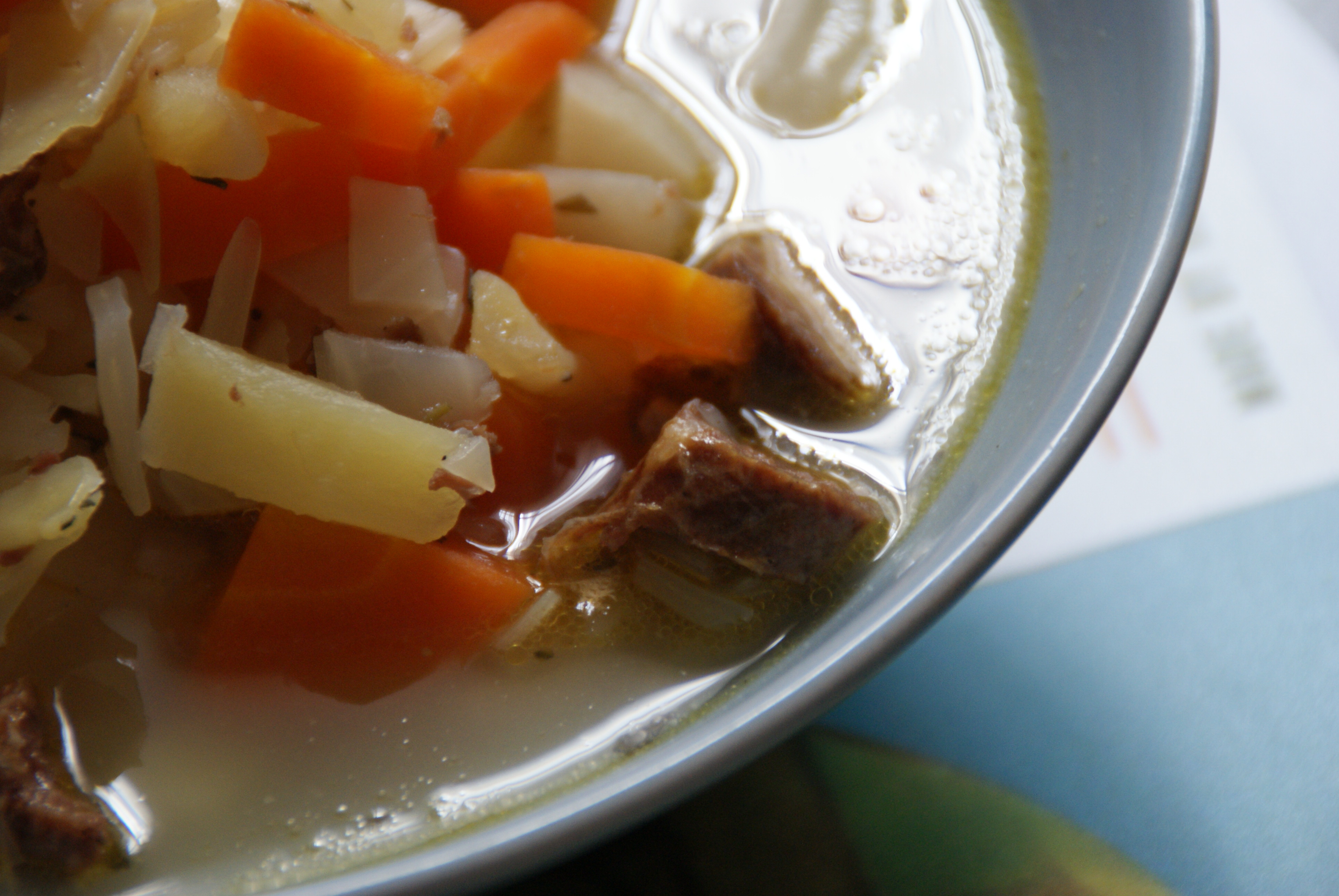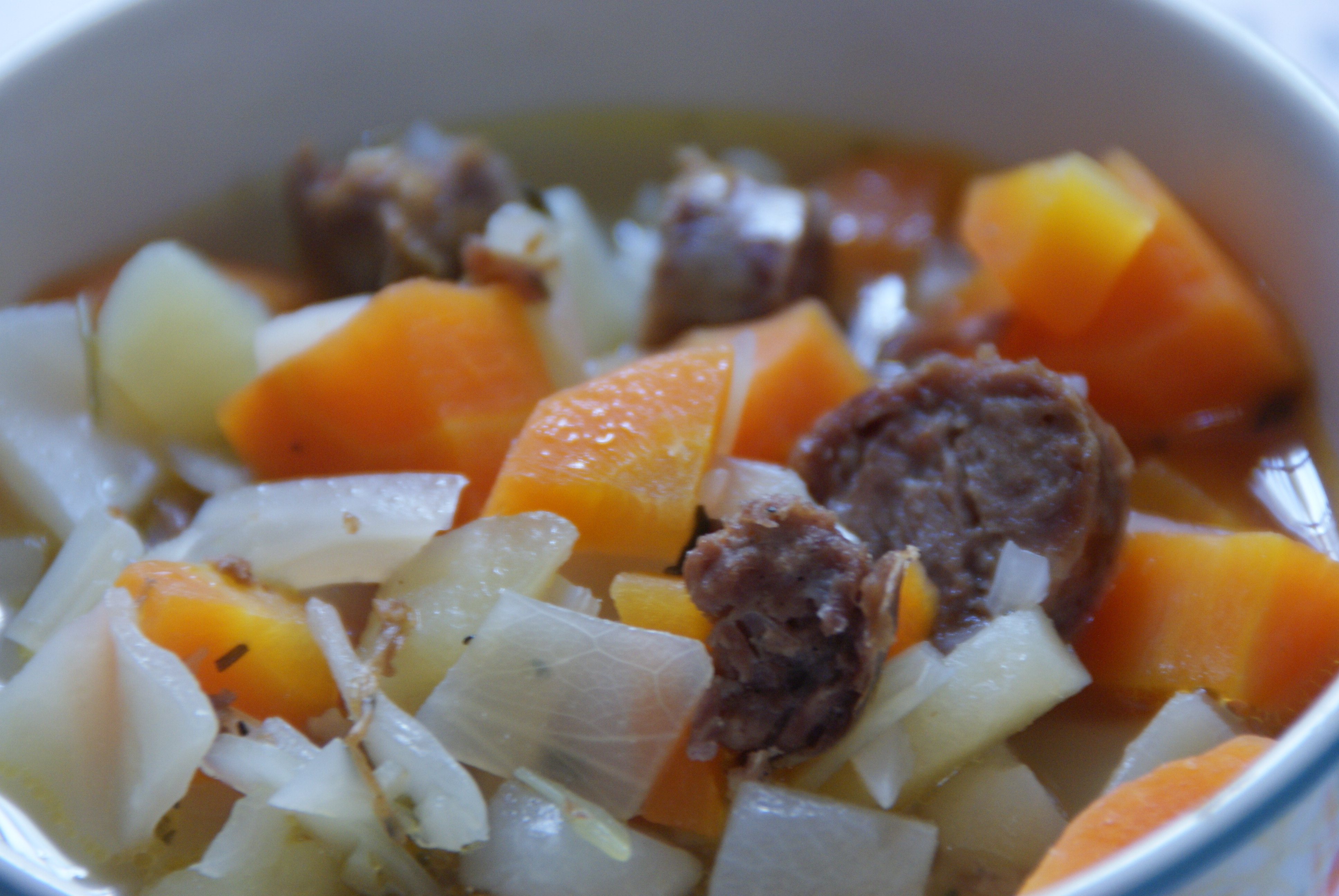 Epluchez et coupez les légumes, tous, y compris le chou lorsqu’il n’est plus chaud. Remplir un fait-tout à moitié d’eau et mettez-y vos légumes puis les saucisses coupées en morceaux. J’ai pris des saucisses « faites maison », je vous conseille d’en prendre avec du goût pour qu’elles relèvent la soupe. Assaisonnez à votre convenance (pour moi ce fut juste sel, poivre, thym) et laissez mijoter 1 heure voir 1 heure 30 sur feu moyen. C’est prêt!