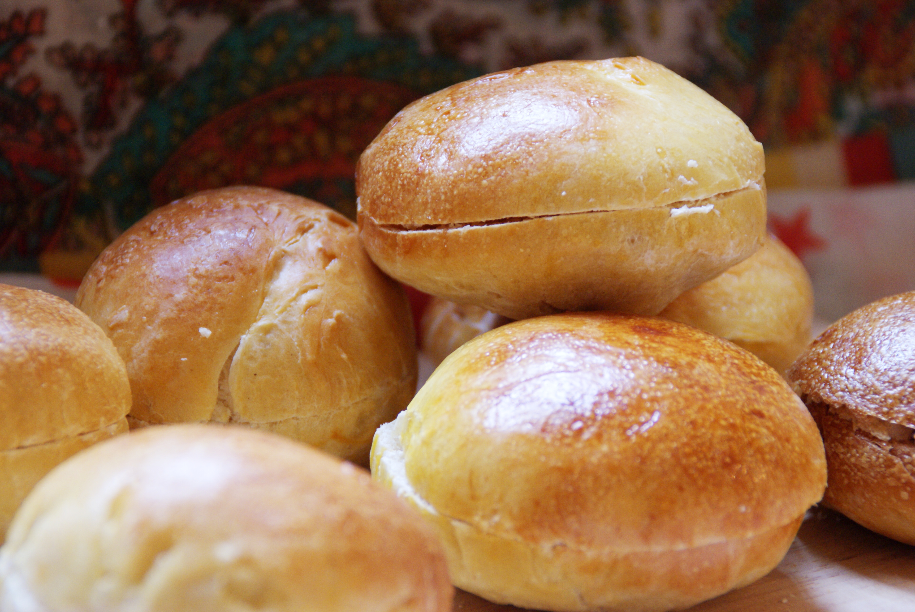 SONY DSC  Commençons par les buns; pour 8: 500g de farine, 2cuillères à café de levure de boulanger, 10g de sel, 25g de sucre, 200mL, 75mL de lait, 2 oeufs, 30g de beurre ramolli + 1 jaune d’oeuf pour la dorure et des graines mais c’est en option (sésame, pavot…)