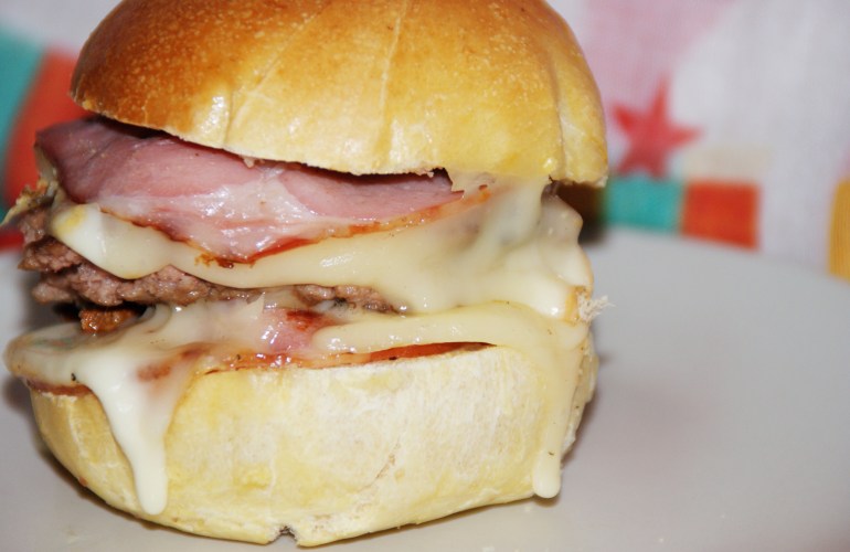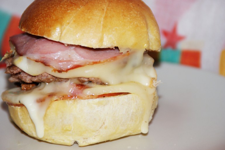 Le montage: bun – bacon – fromage – steak – fromage – bacon – bun. Je les passe aller-retour au four pour que le fromage fonde. Et voilà :)