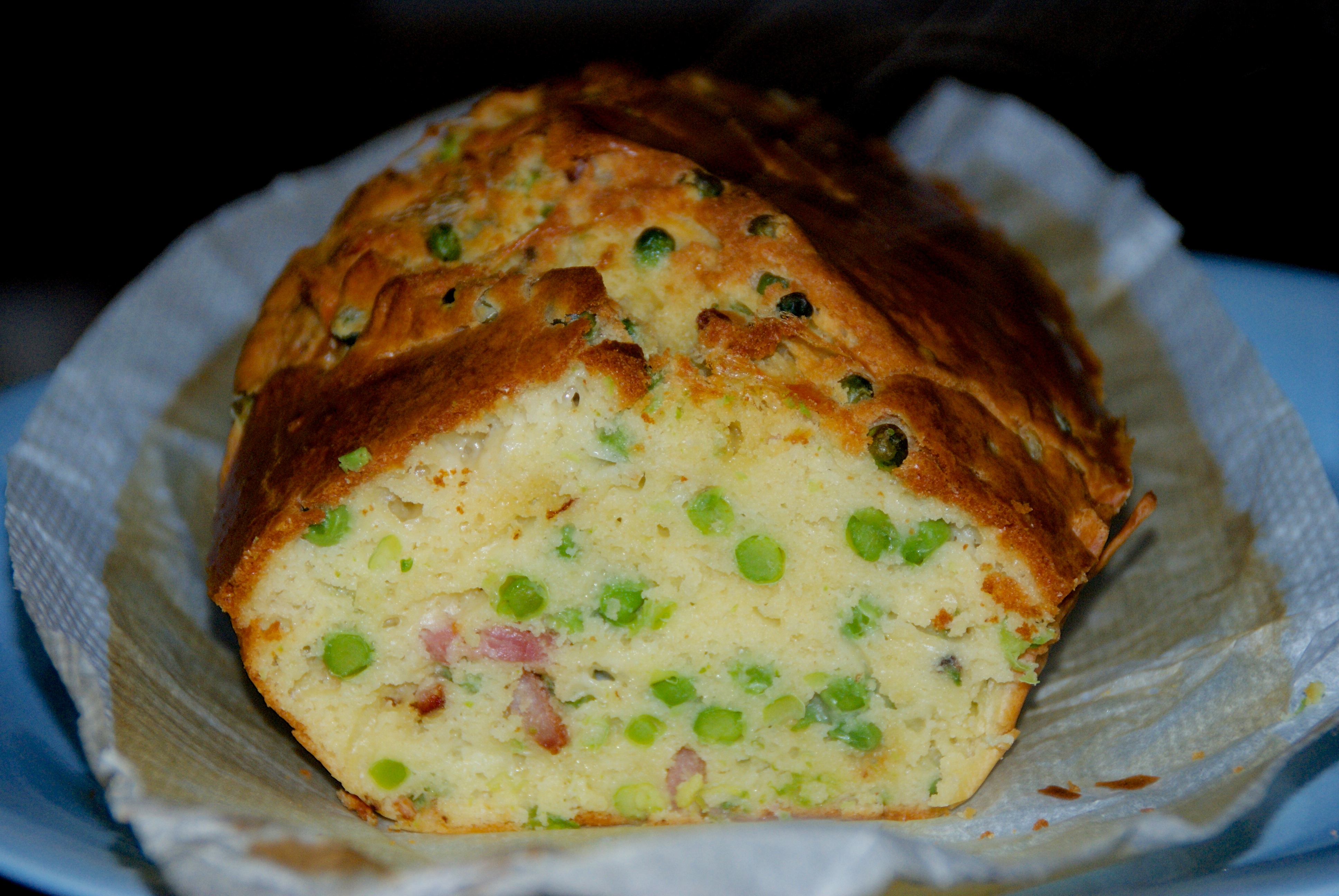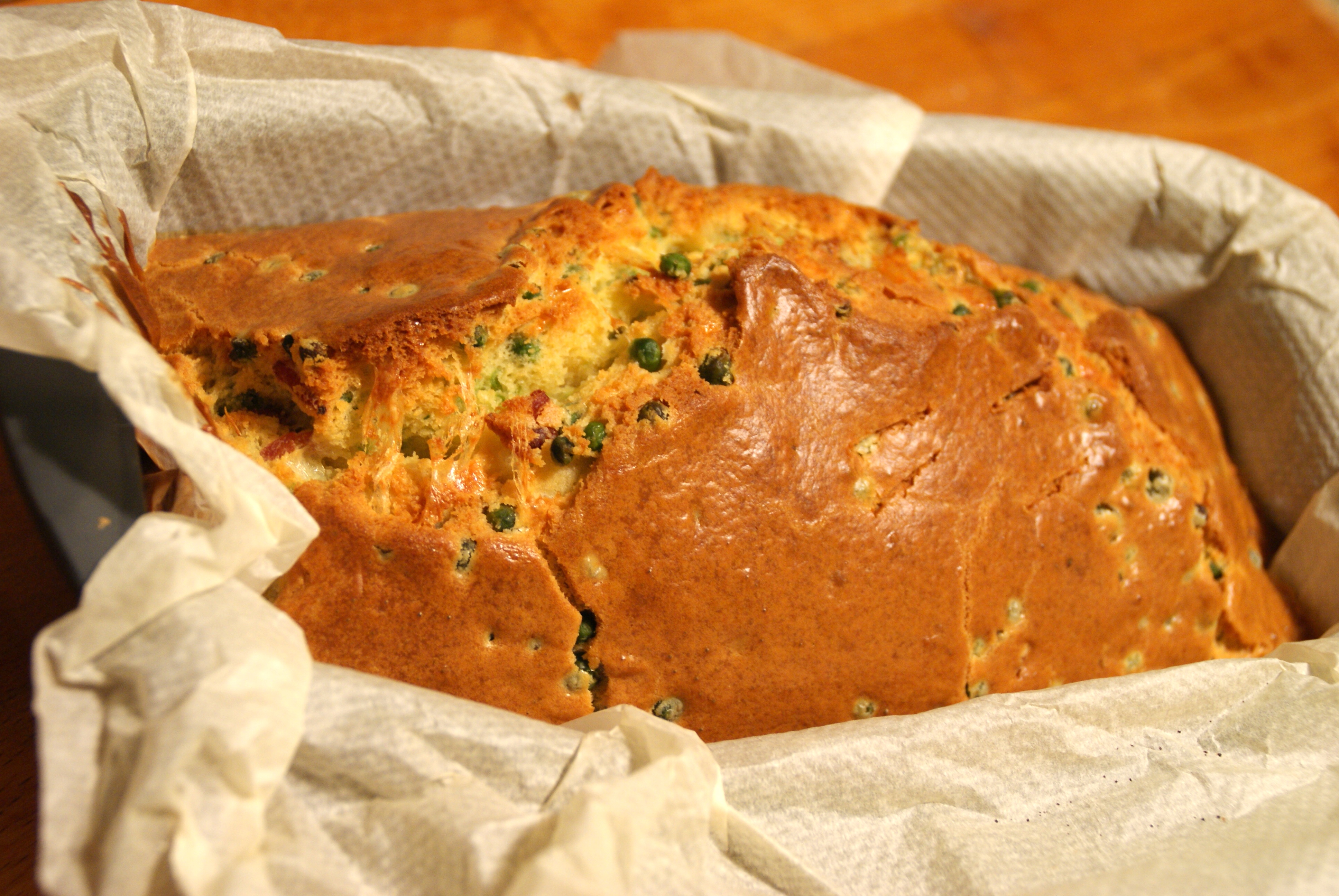 Il vous faut: 200g de farine, 1 sachet de levure, 4 oeufs, 70mL d’huile d’olive, 12cL5 de lait, 100g de râpé, 150g de lardons, 150g de petits pois, sel et poivre.