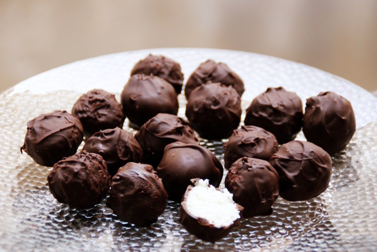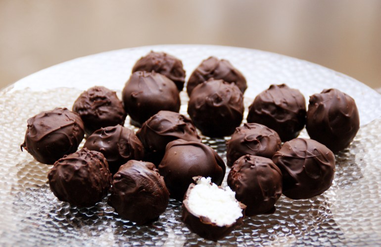 Au bout 30 minutes, faites fondre le chocolat dans un bol. Sortez vos boulettes et, une à une, faites les tremper dedans. Pour que le chocolat soit bien réparti je m’aide d’une fourchette et fait tourner les boulettes dans le chocolat. Posez vos rochers sur du papier sulfurisé et hop, au frais pendant environ 30 minutes (faites encore attention à ce qu’elles ne se touchent pas).