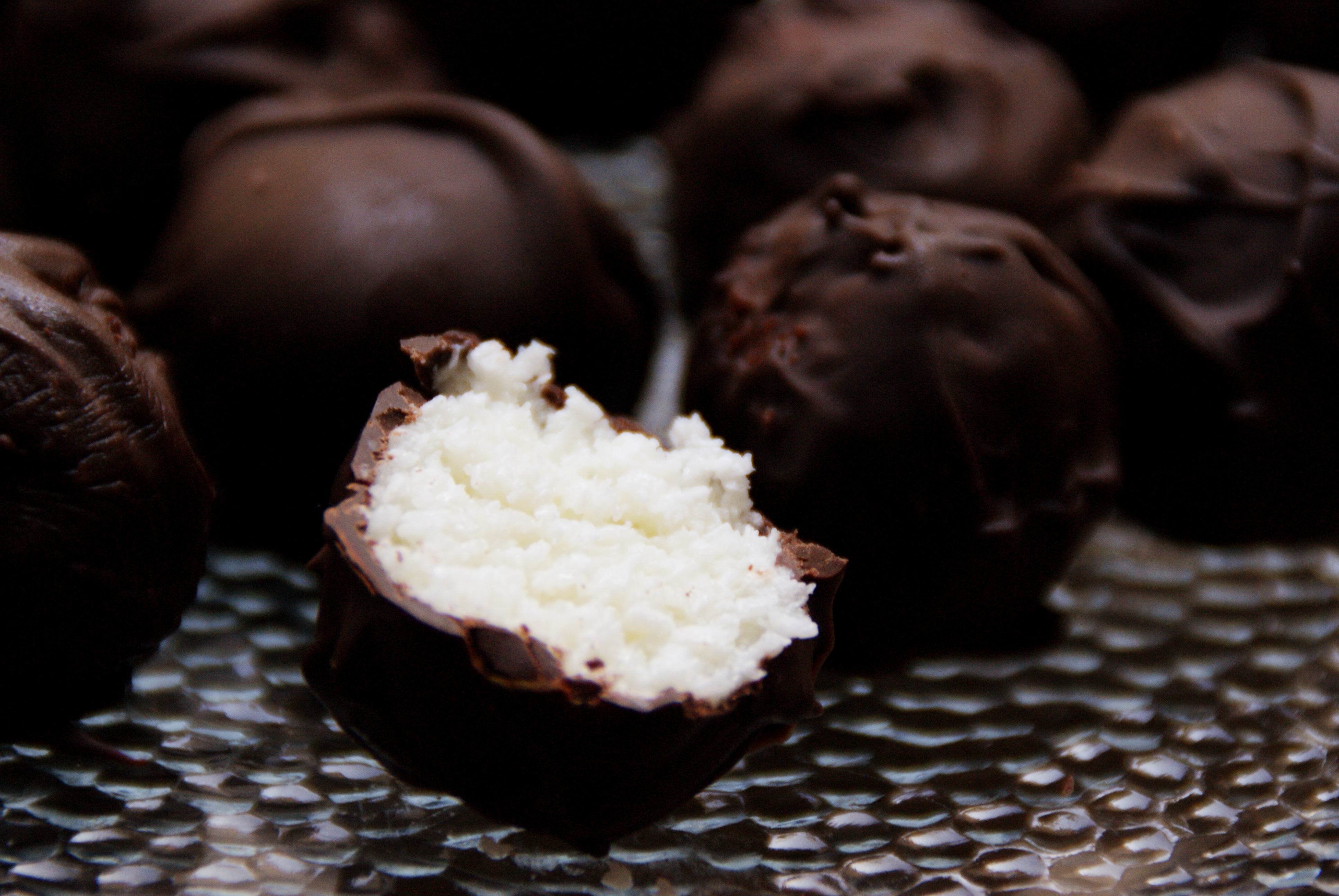 Au bout 30 minutes, faites fondre le chocolat dans un bol. Sortez vos boulettes et, une à une, faites les tremper dedans. Pour que le chocolat soit bien réparti je m’aide d’une fourchette et fait tourner les boulettes dans le chocolat. Posez vos rochers sur du papier sulfurisé et hop, au frais pendant environ 30 minutes (faites encore attention à ce qu’elles ne se touchent pas).