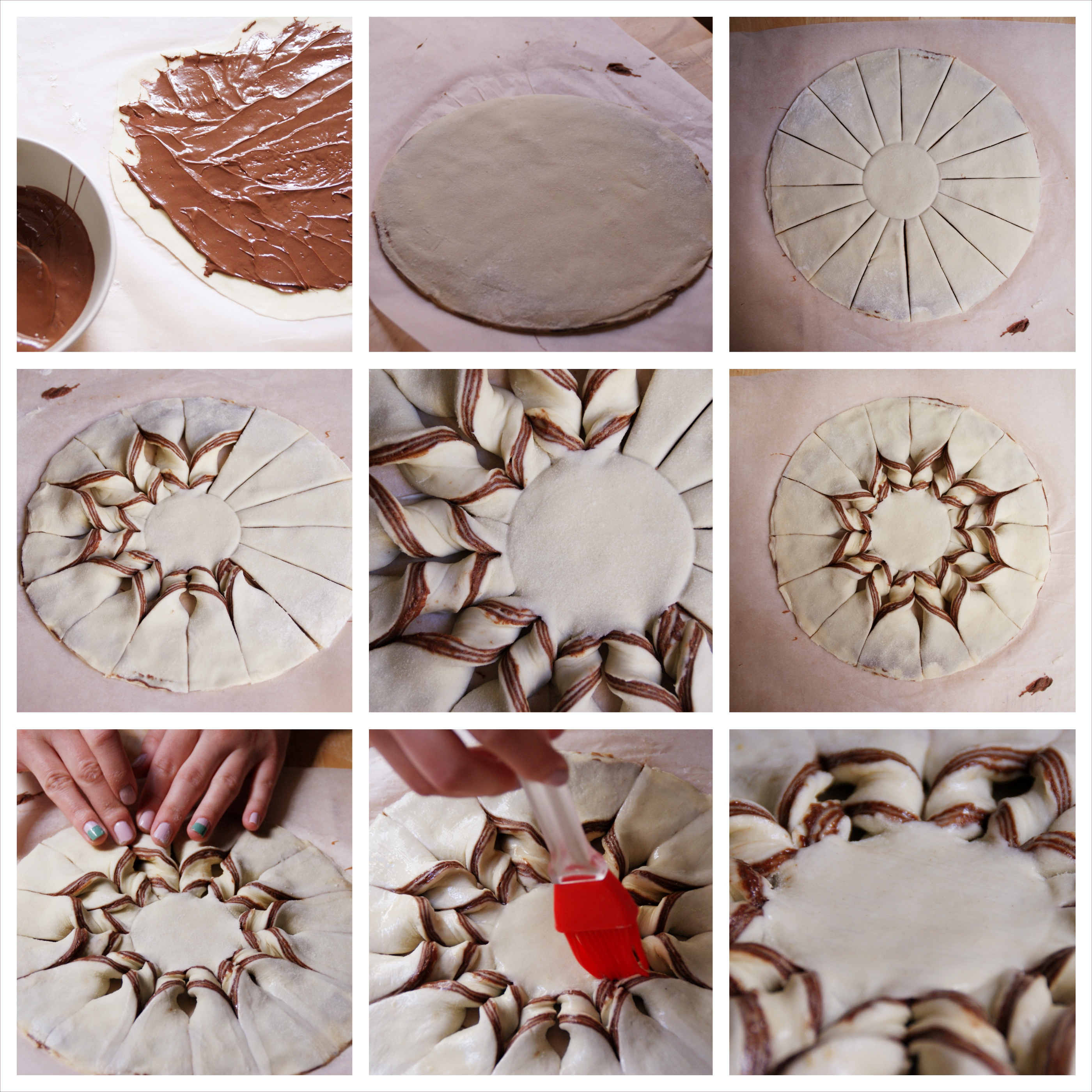 Il vous faut: 2 pâtes feuilletées, un bon pot de pâte à tartiner,  un blanc d’oeuf.