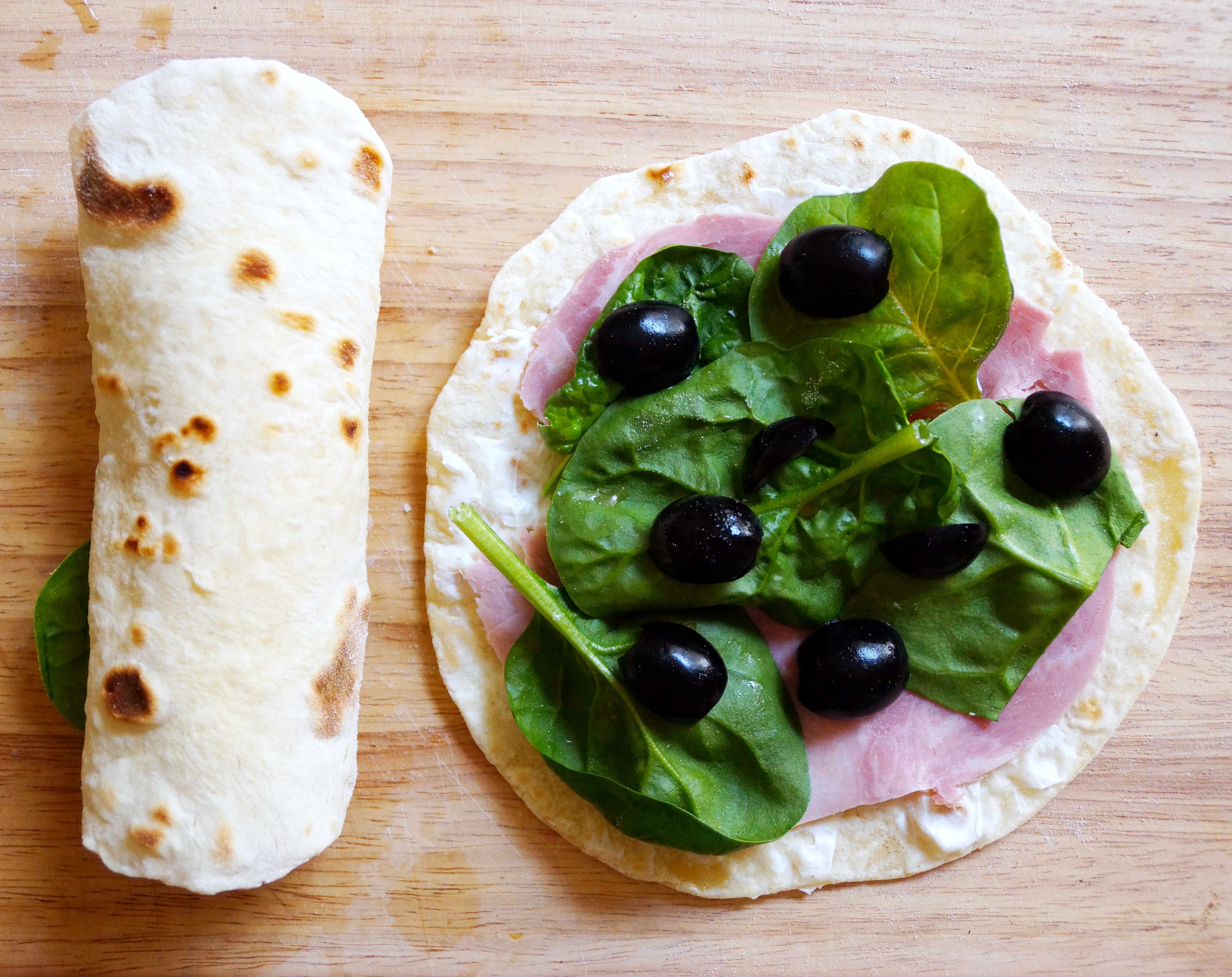 Prenez votre galette, étalez le Philadelphia, mettez votre tranche de jambon puis quelques pousses d’épinards et quelques olives. Roulez et mangez!
