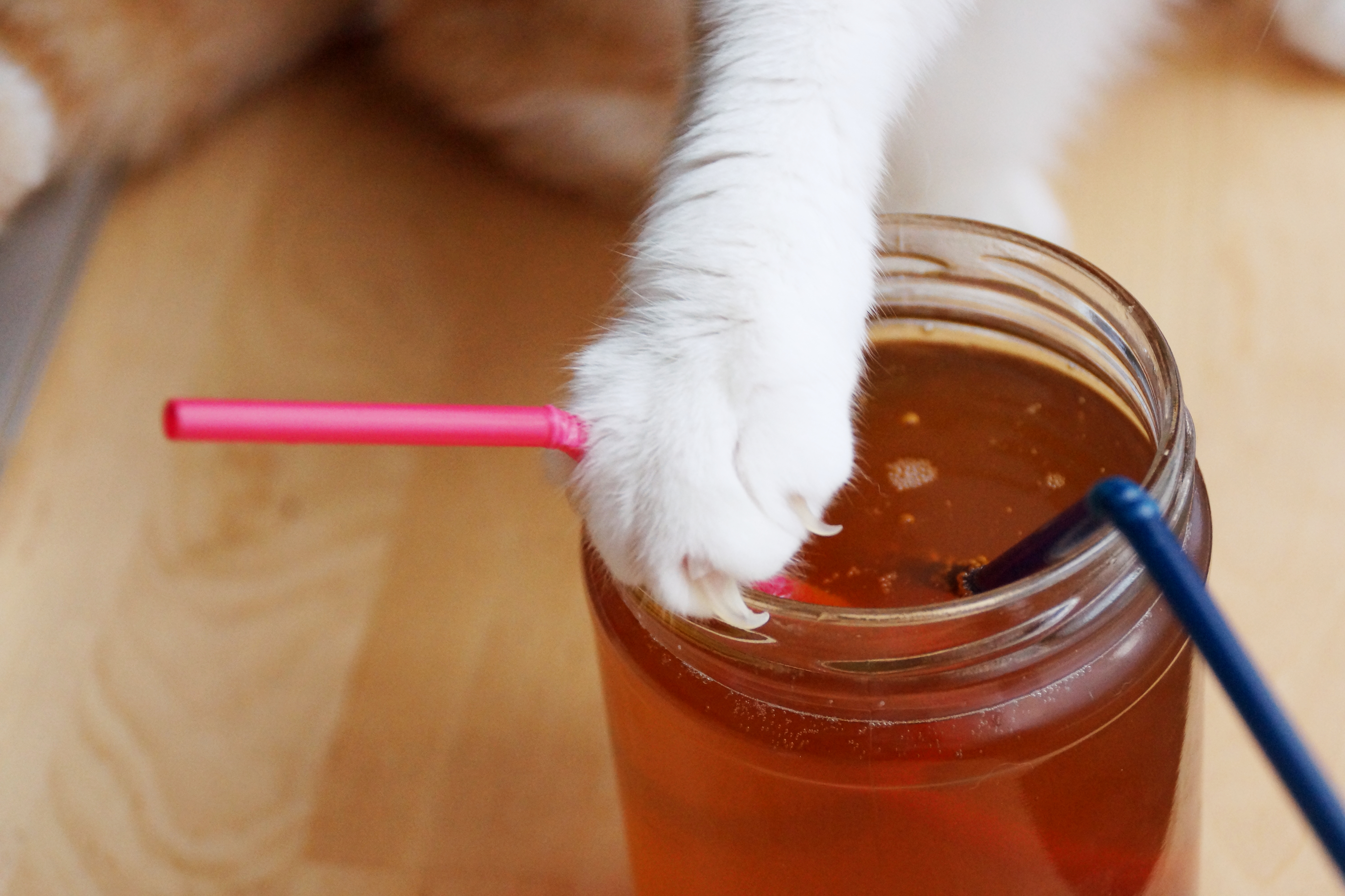 J’ai mis tout ça dans un bocal de 50cl, 2 pailles et hop! Ah, et puis monsieur chat est passé par là, il adore les pailles :)