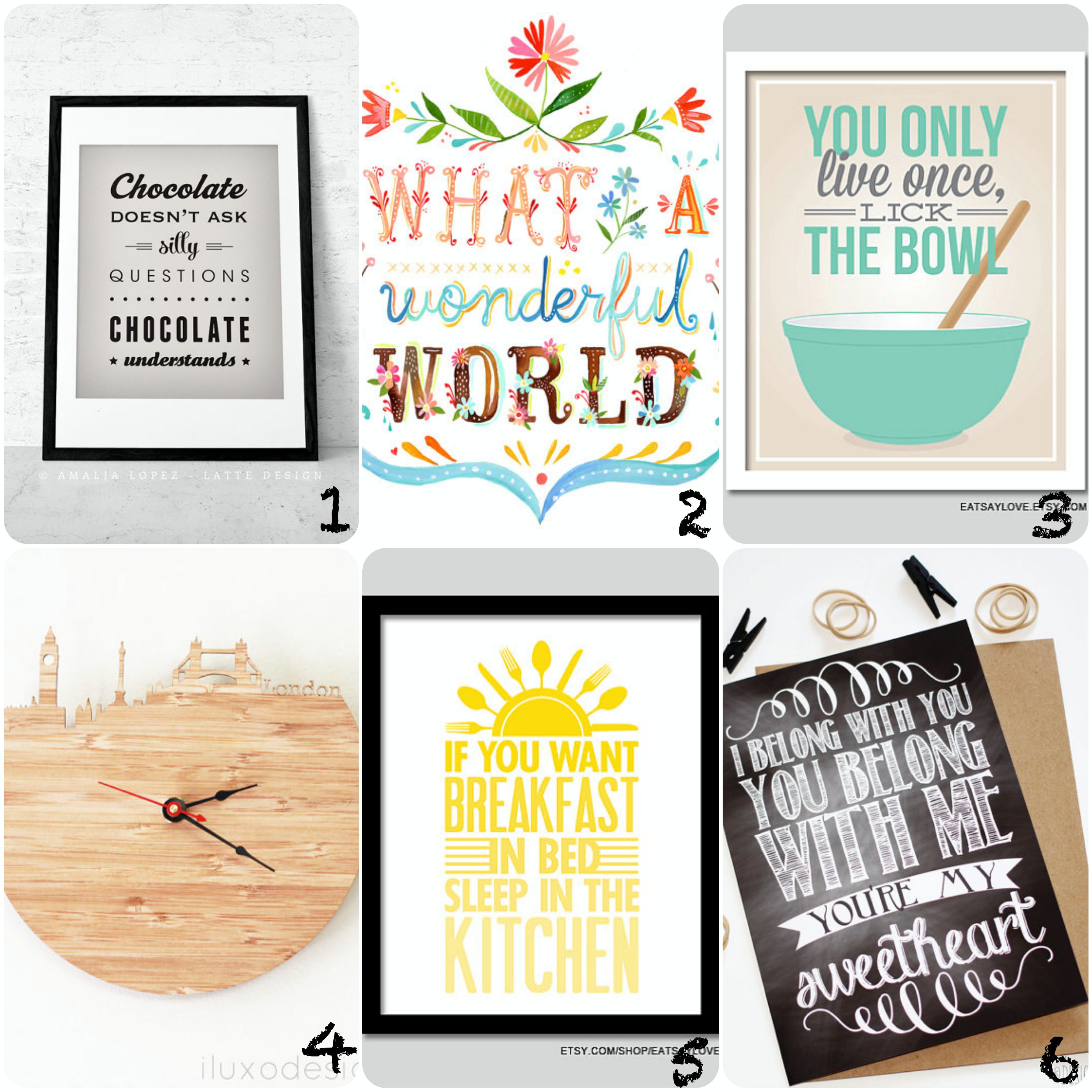Hello! Ca va bien chez vous? En ce moment je suis en pleine réflexion pour refaire ma cuisine qui est (et c’est peu de le dire) très moche. Genre vert flash et vert arbre (même la fenêtre, les locataires précédents étaient fous). Alors on se promène chez Leroy, chez Casto et sur le net pour trouver la bonne couleur; on y arrive peu à peu et en attendant de repeindre je cherche sur Internet avec quoi je pourrais la décorer. Aujourd’hui je vous propose une sélection Etsy spéciale déco murale, encadrés toussa toussa qui iront aussi bien dans la cuisine qu’ailleurs. Pour voir mes précédents articles sur Etsy c’est par là: la mine d’or & côté déco.