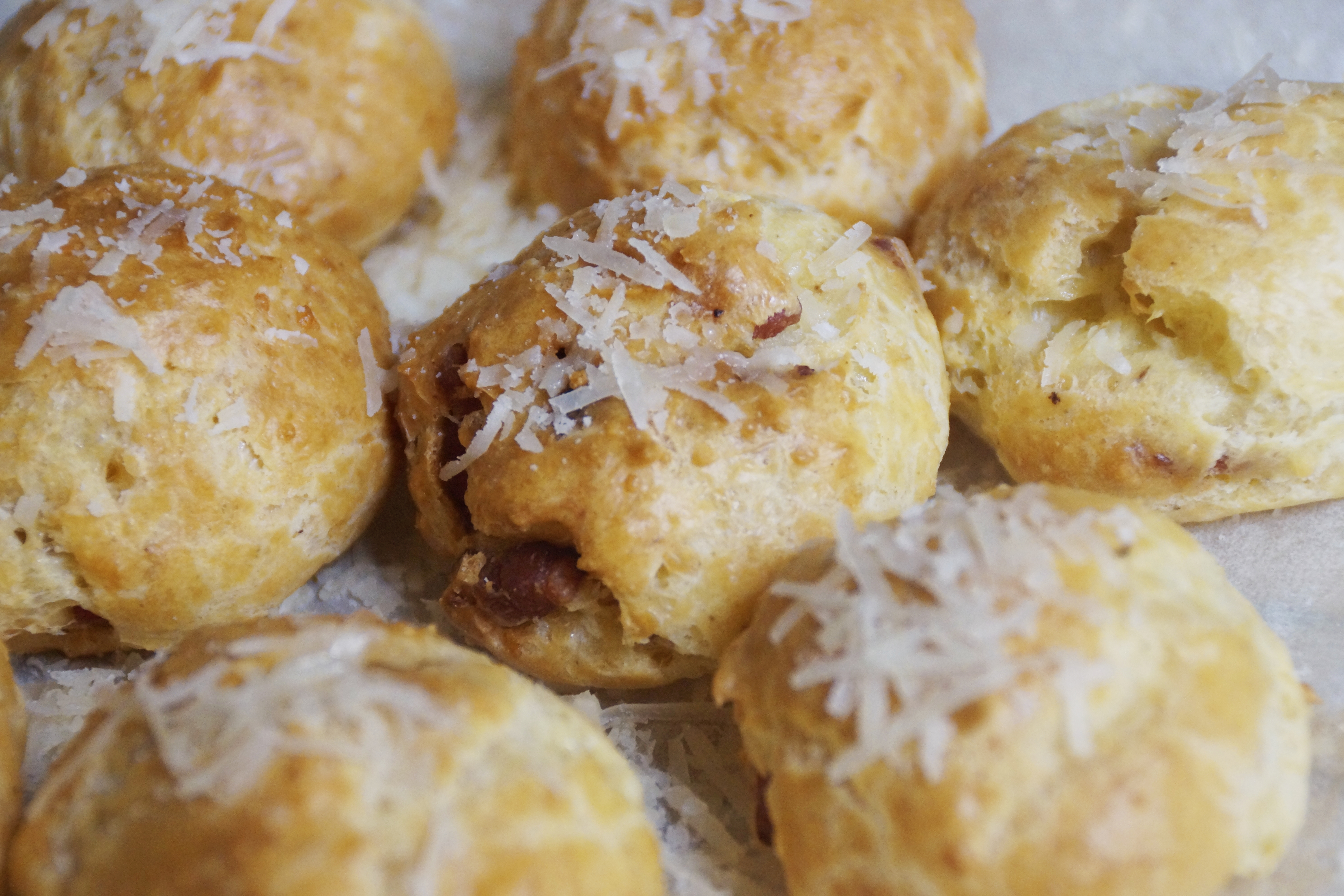 _DSC1861_fotorIl vous faut: 75g de beurre, 150g de farine, 25cl d’eau, 4 oeufs, 1 pincée de sel, 100g de parmesan râpé (+ un peu pour le dessus), 100g de lardons.
