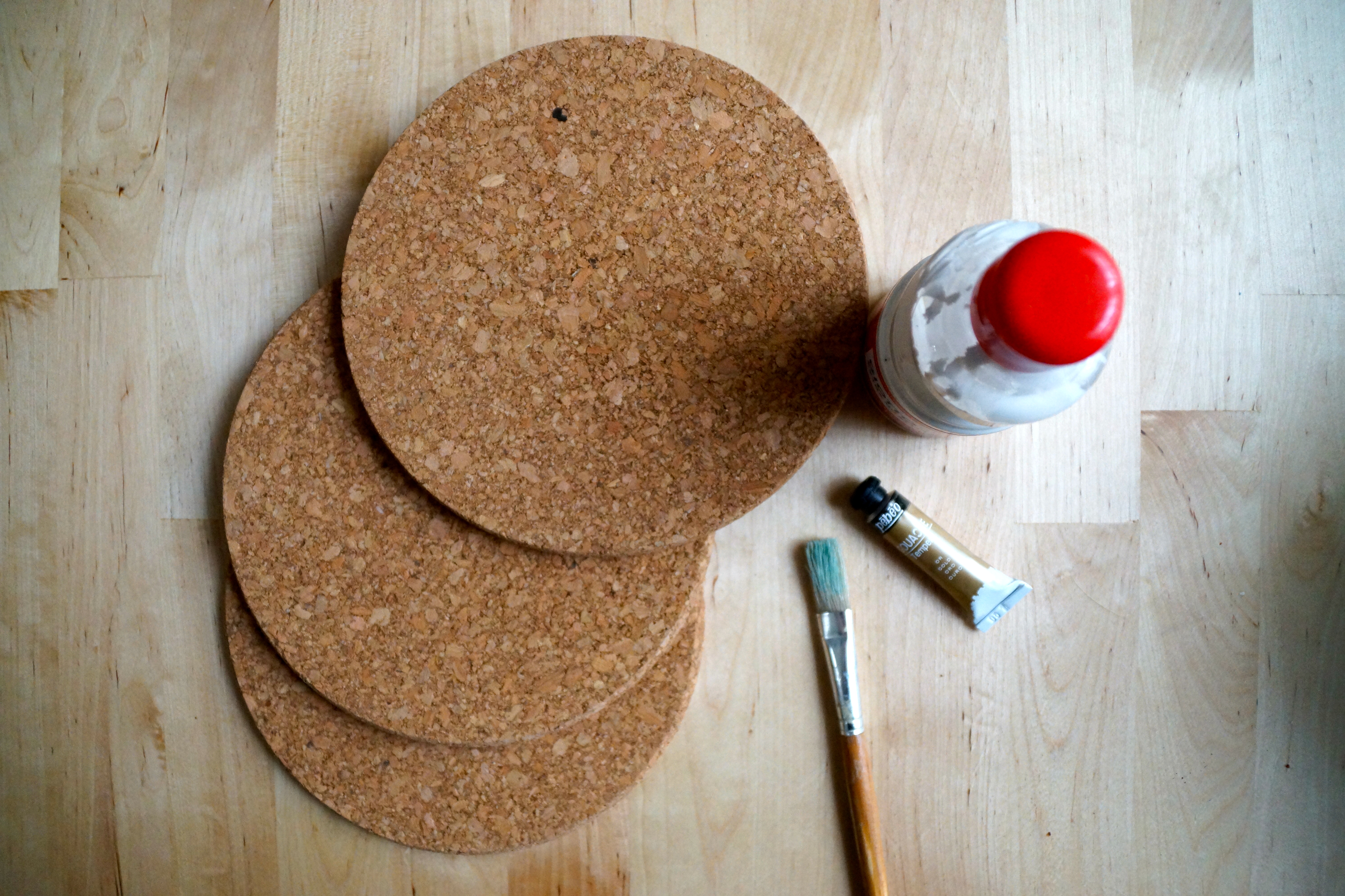 J’ai utilisé: 3 sous-plat en liège de chez Ikea (ici), un pinceau, de la peinture doré et de la blanche.