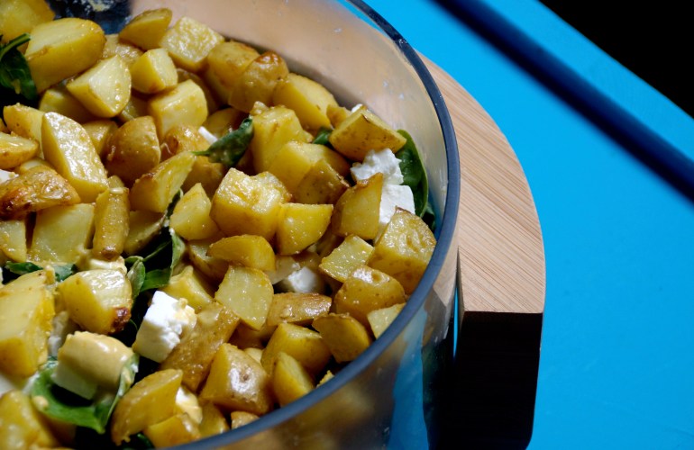Pour 6 personnes: 2 sachet de pousses d’épinards ou de roquette, environ 1kg de pommes de terre petit calibre, 2 cuillères à soupe de moutarde, de l’huile d’olive et le jus d’un citron (et cette fois-ci j’avais ajouté une brique de fêta).