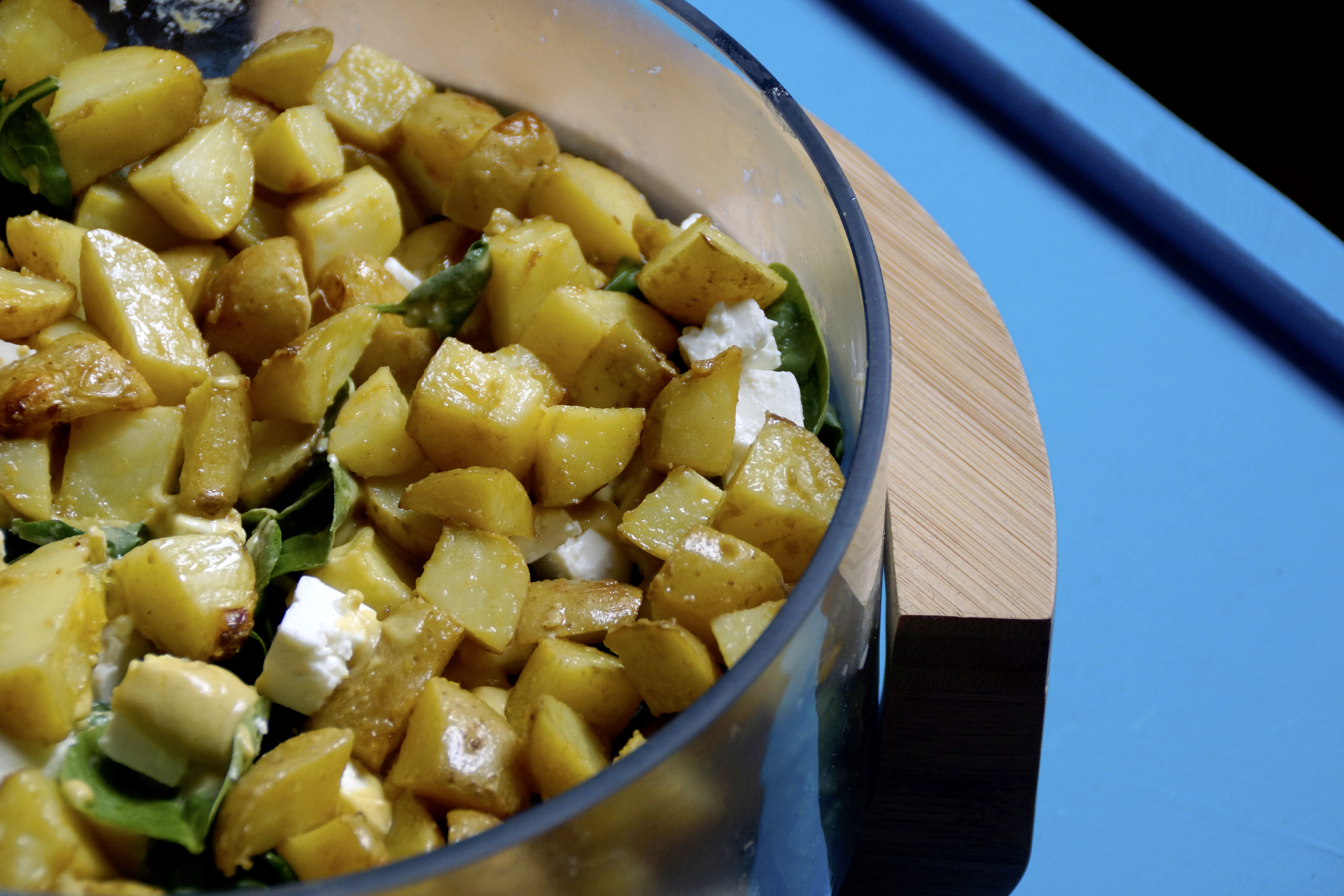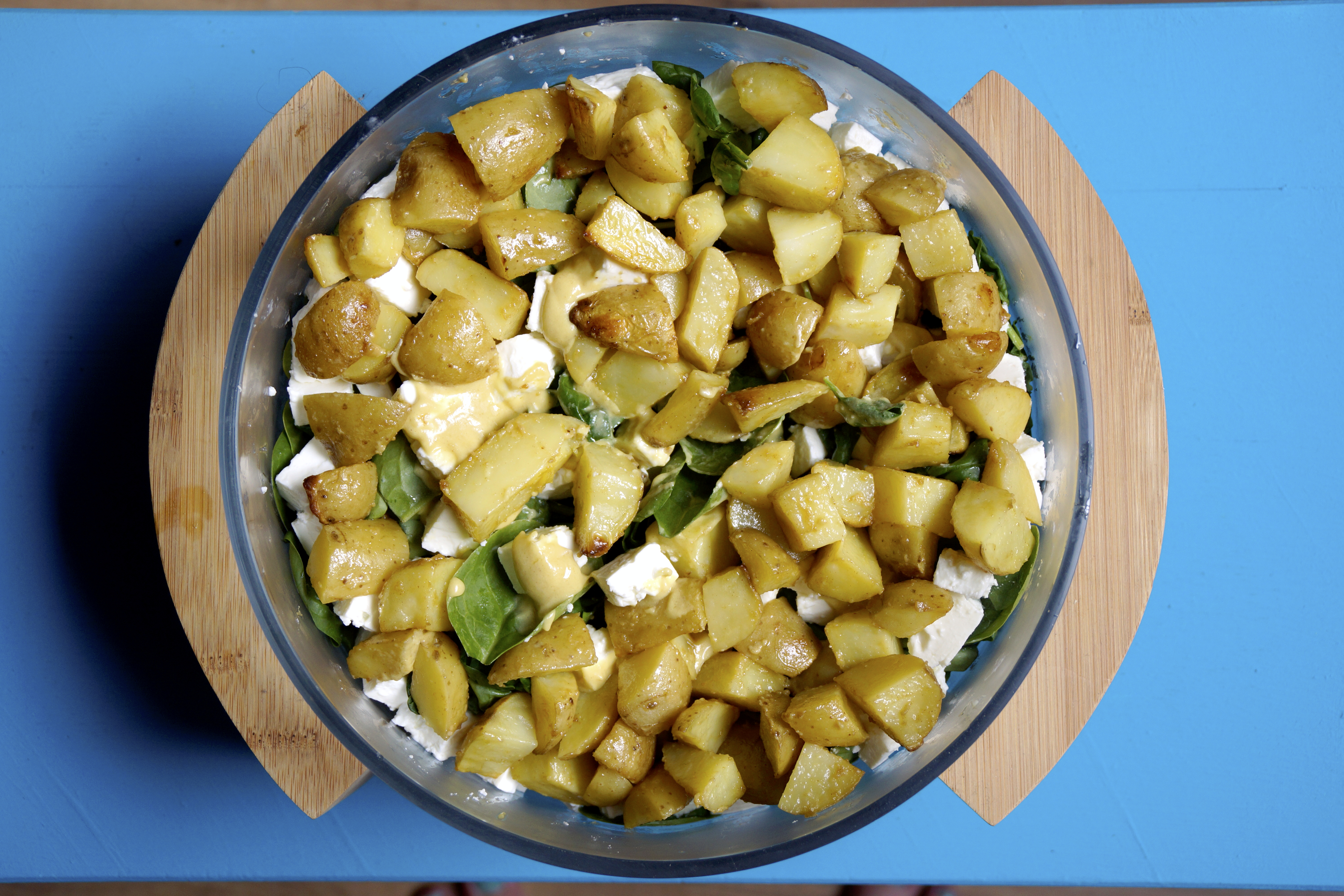 Pour 6 personnes: 2 sachet de pousses d’épinards ou de roquette, environ 1kg de pommes de terre petit calibre, 2 cuillères à soupe de moutarde, de l’huile d’olive et le jus d’un citron (et cette fois-ci j’avais ajouté une brique de fêta).