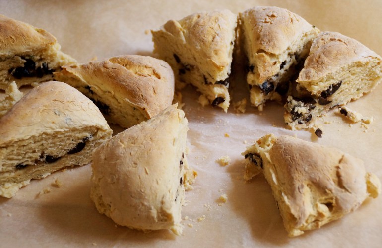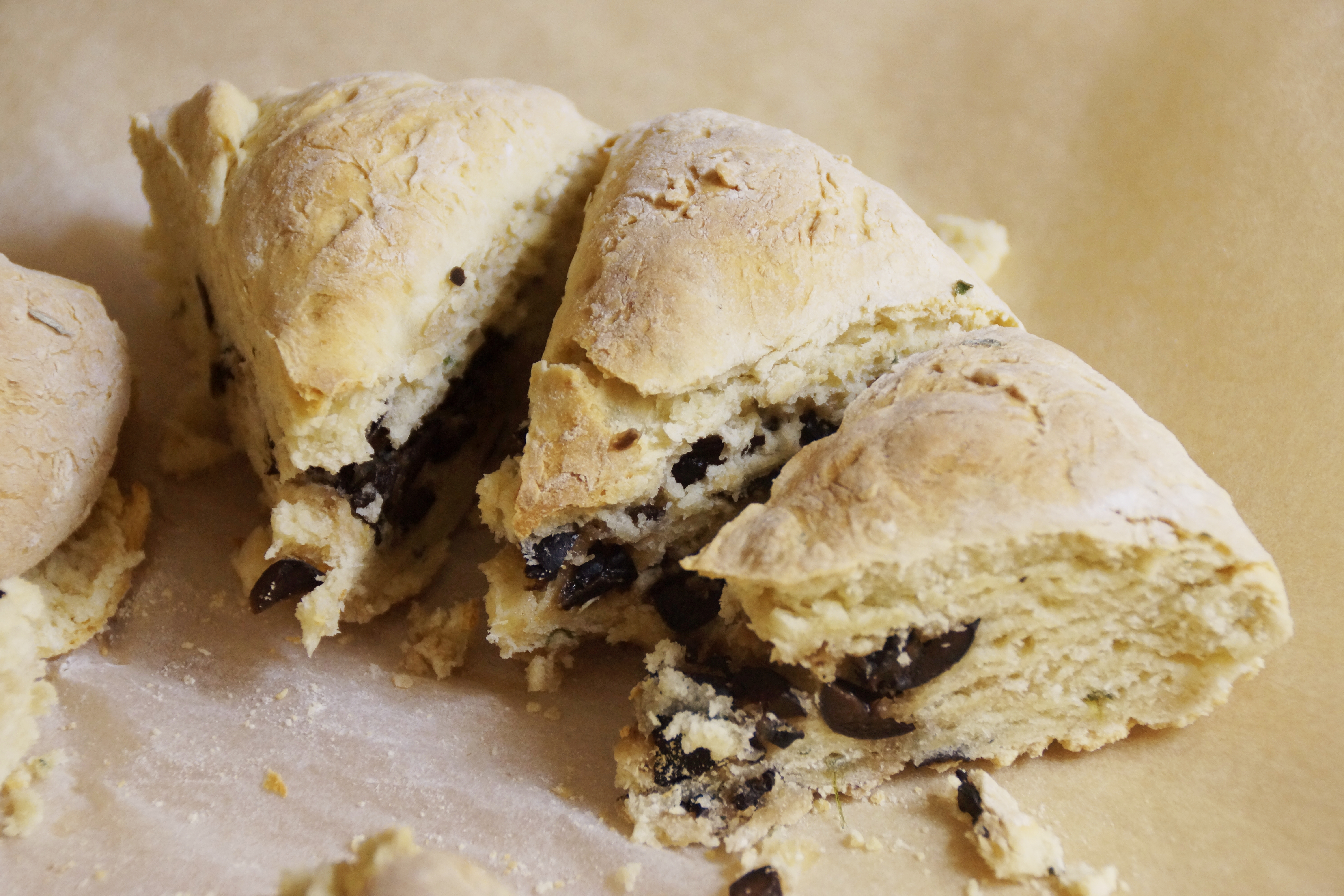 Hello! J’espère que vous allez bien, c’est samedi = sortez les confettis! Je vous présente un pain aux olives et au thym qui n’a pas besoin de repos ni de levure spéciale, il prend peu de temps à faire et pourtant il est vraiment très bon et gourmand! J’ai pioché cette recette de Lorraine Pascale en regardant Cuisine TV, cette nana fait des trucs ultra simples mais tellement bons que je pourrais manger ma télé quand je la regarde! La recette originale est avec du romarin, mais j’ai choisi le thym tout simplement parce que je le fais pousser moi-même :)