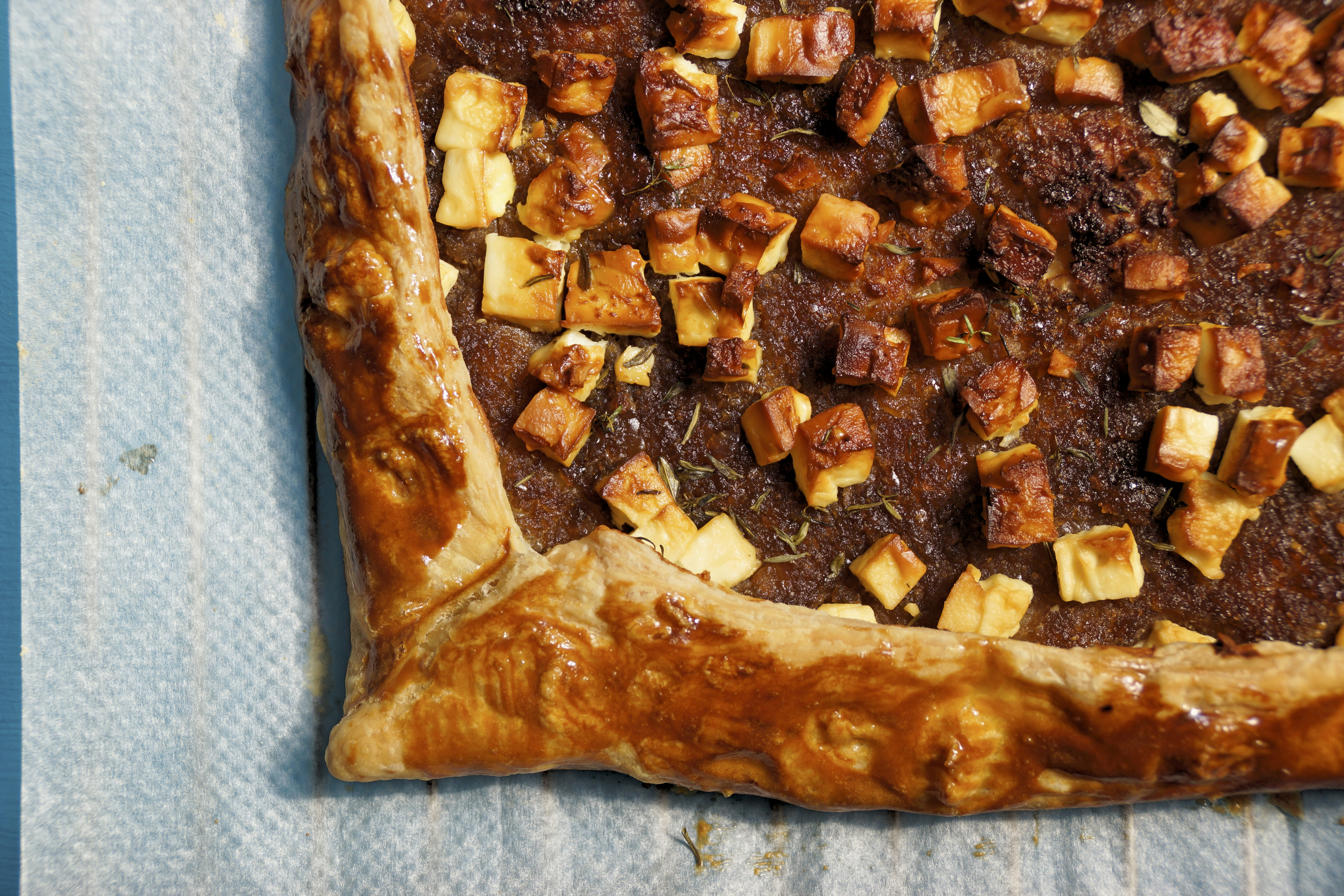Etalez votre rouleau de pâte feuilletée. Je préfère l’étaler en rectangle pour mieux la partager après, mais faites comme vous voulez ^^. Etalez vos oignons caramélisés sur la pâte, découpez votre fêta et parsemez-là sur votre tarte. Ajoutez le thym frais si vous le souhaitez et repliez les bords.