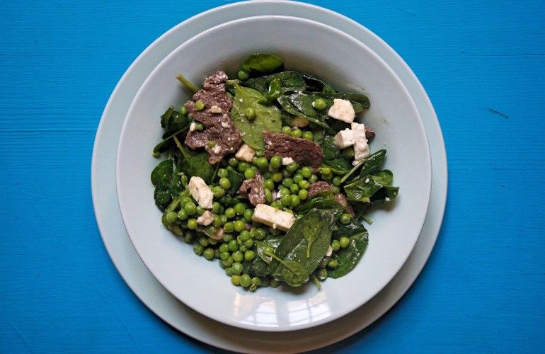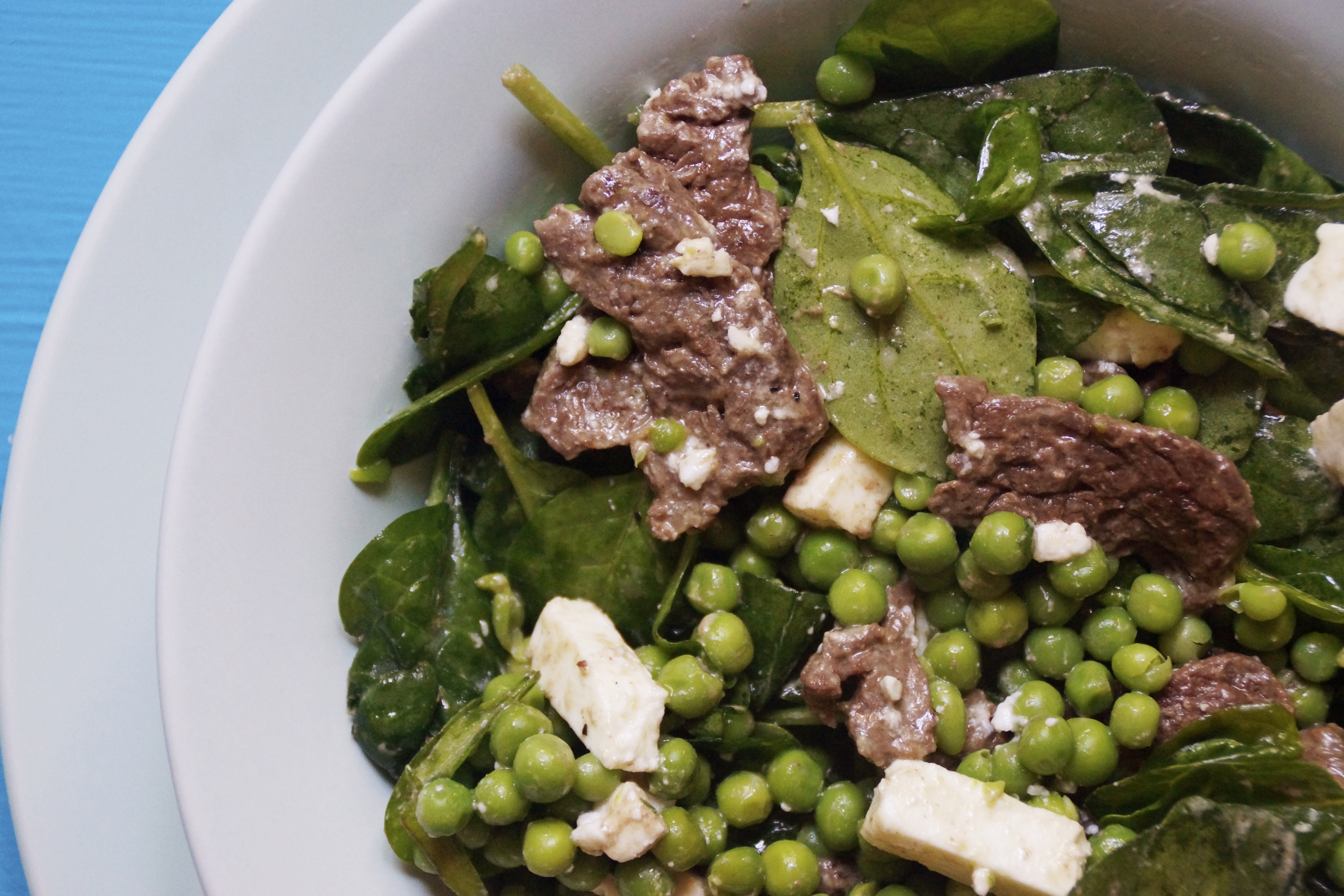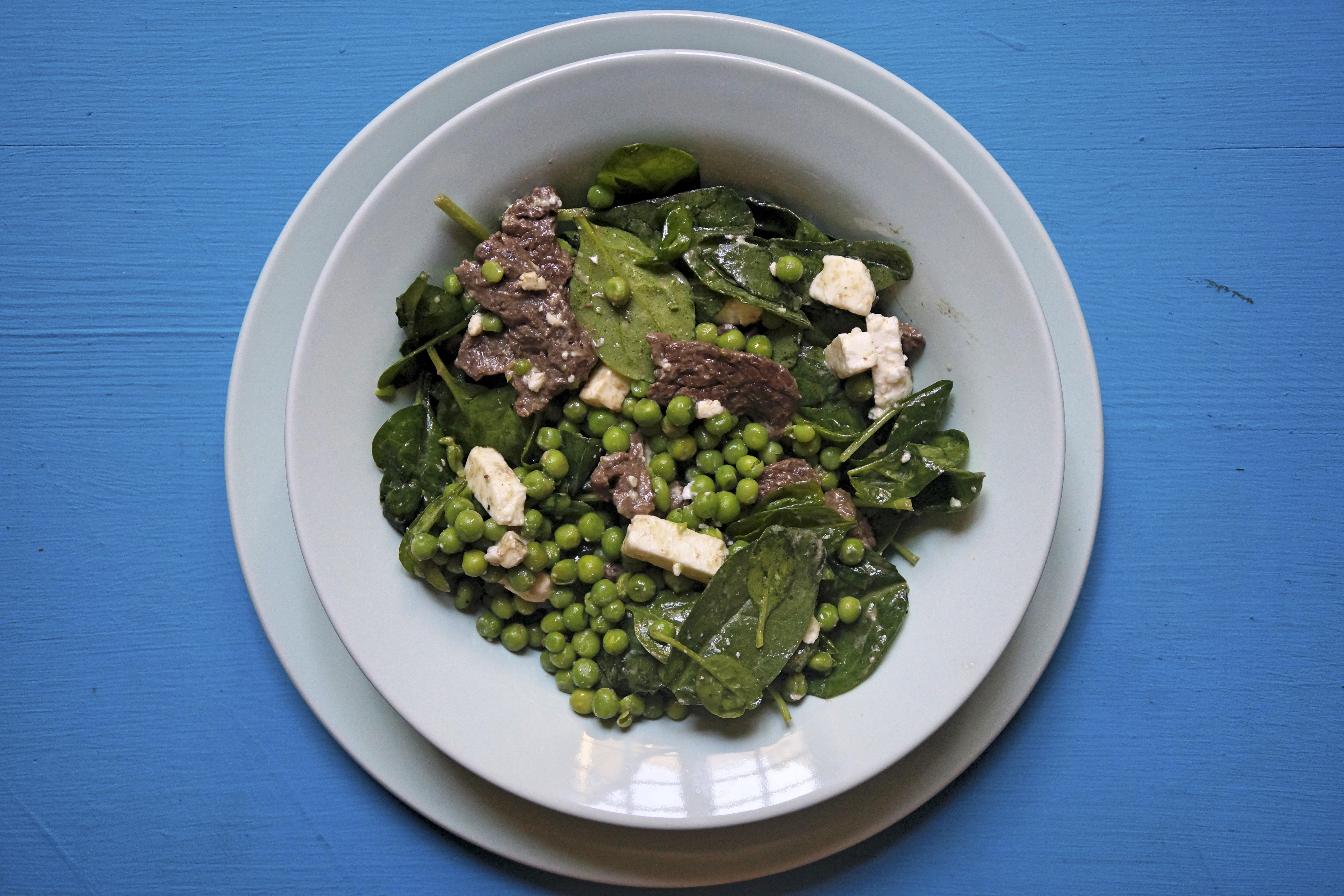 Pour deux j’ai utilisé: la moitié d’une boite de fêta, la moitié d’un sachet de pousse d’épinards, un verre de petits pois congelés puis cuits à la casserole, une belle tranche d’onglet.