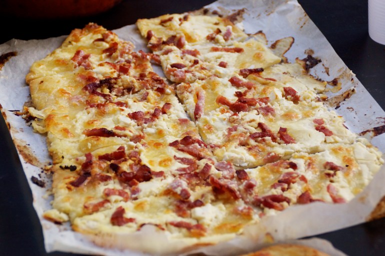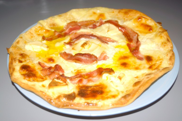 Ma pizza basique se compose de crème fraîche (ou de Tomacouli) et de mozzarelle. J’étale ces ingrédients sur la pâte et je la mets à cuire. Ce n’est que lorsque la mozzarelle a bien fondu que j’ajoute le reste: lardons ou pommes de terre (déjà cuit(e)s), jambon, fêta, oignons, poitrine fumée, oeufs… etc que j’arrose d’un filet d’huile d’olive. Je remets ensuite à dorer 5 minutes et voilà!