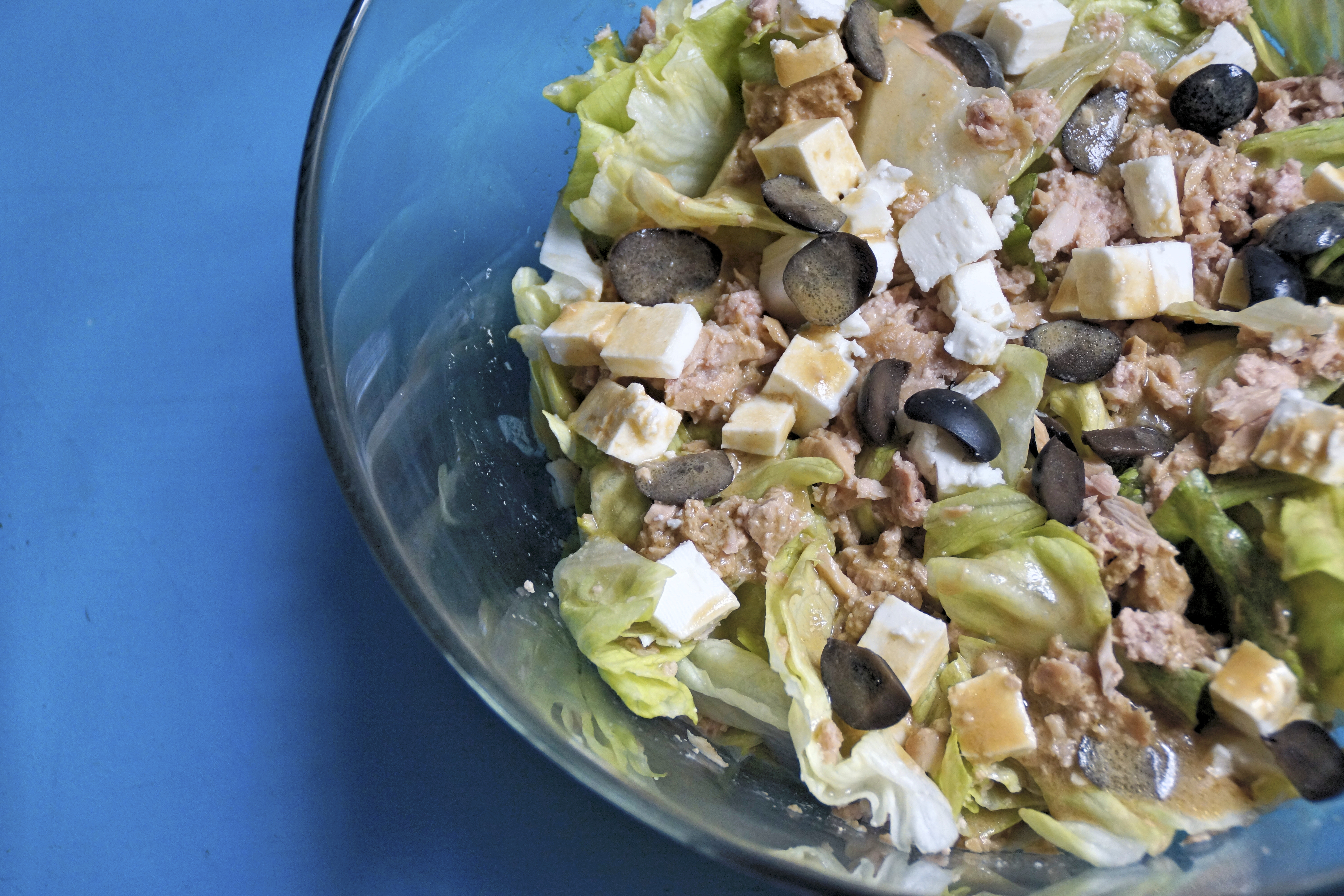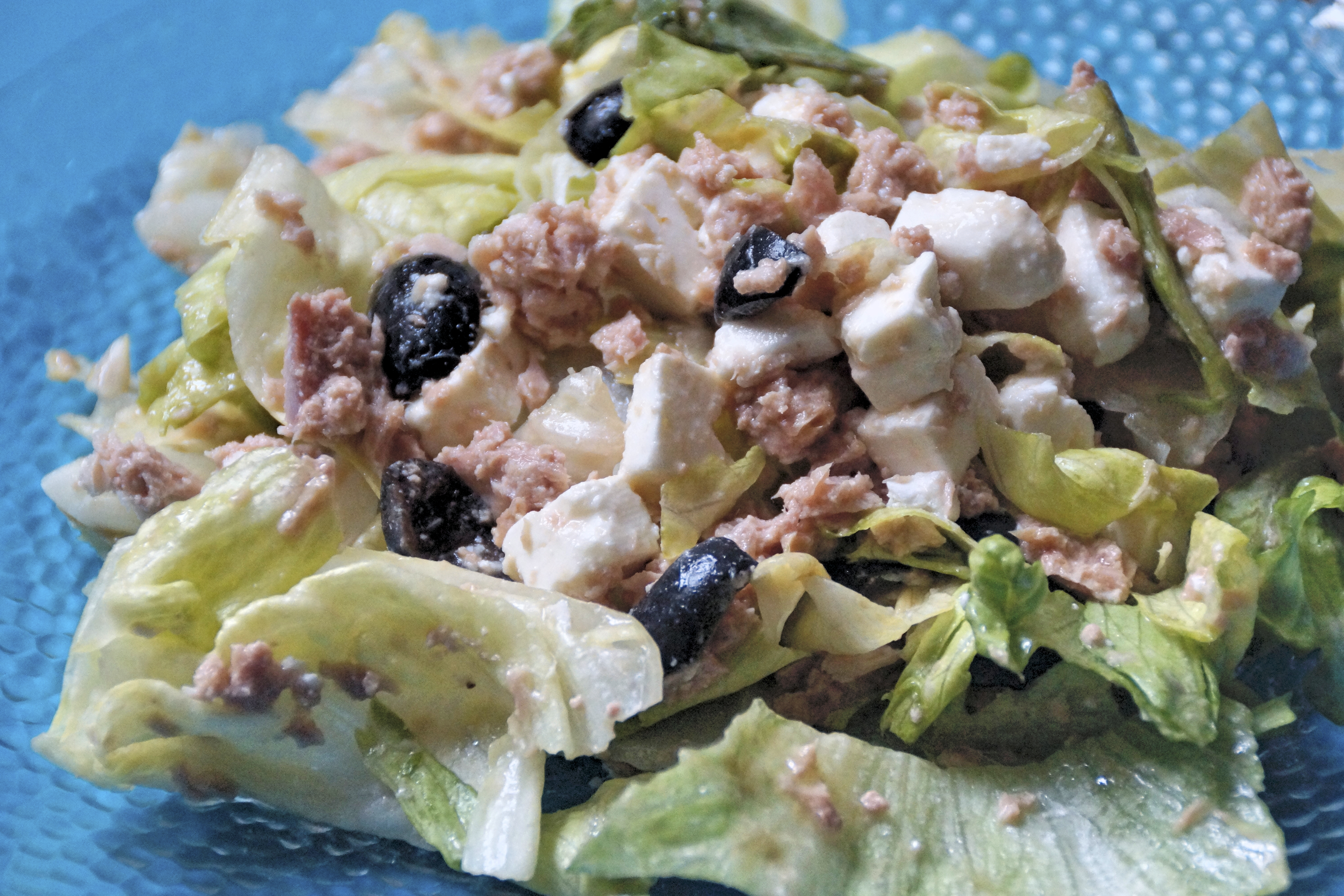 Il vous faut: un sachet de salade ou une salade , une boîte de thon, de la fêta, quelques olives. Pour la sauce: de l’huile d’olive, le jus d’un citron, une cuillère soupe de moutarde et du sel.