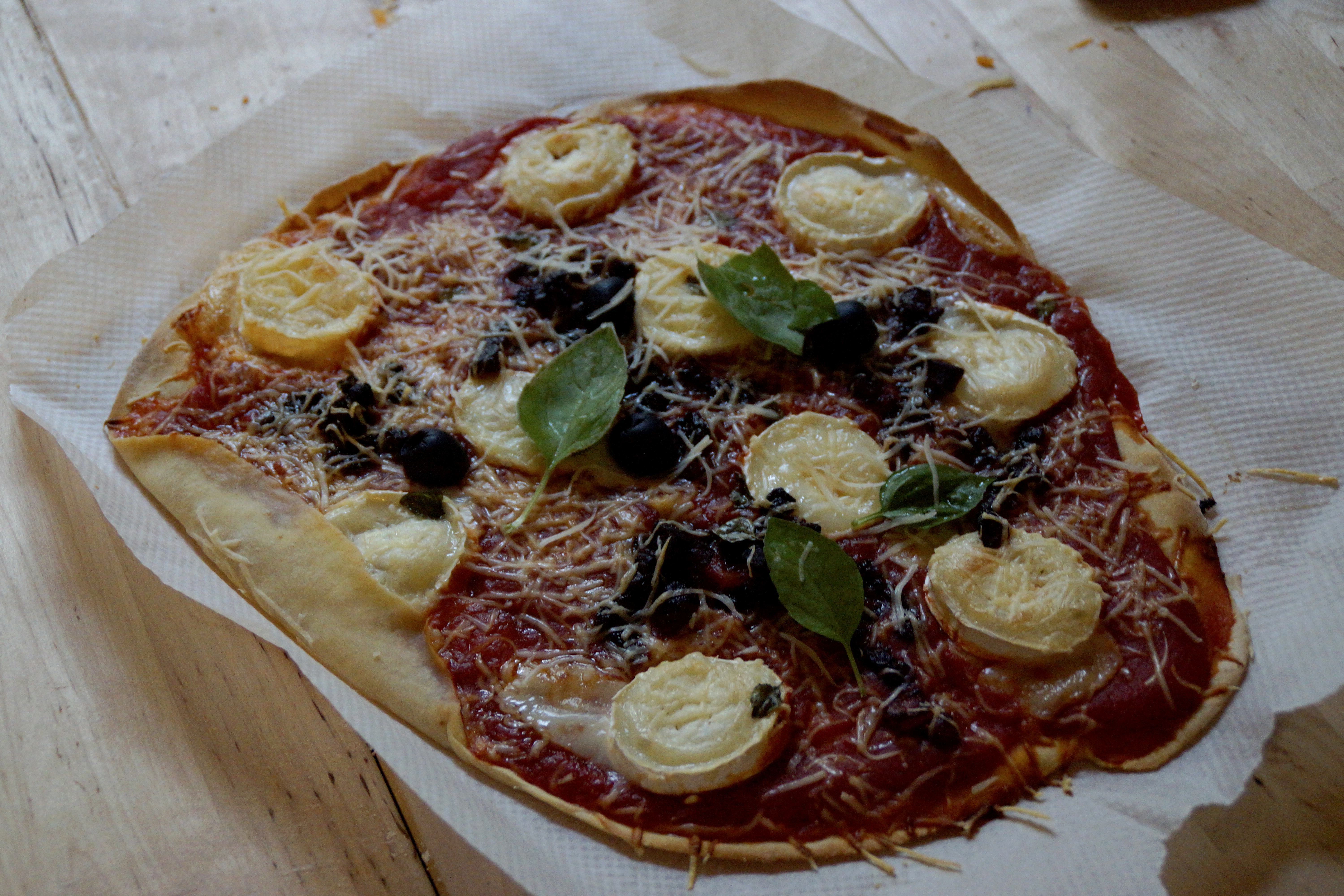 Les ingrédients: Tomacouli (4 cuillères à soupe), emmental râpé, fromage de chèvre, 100g de lardons, olives noires et feuilles de basilique.