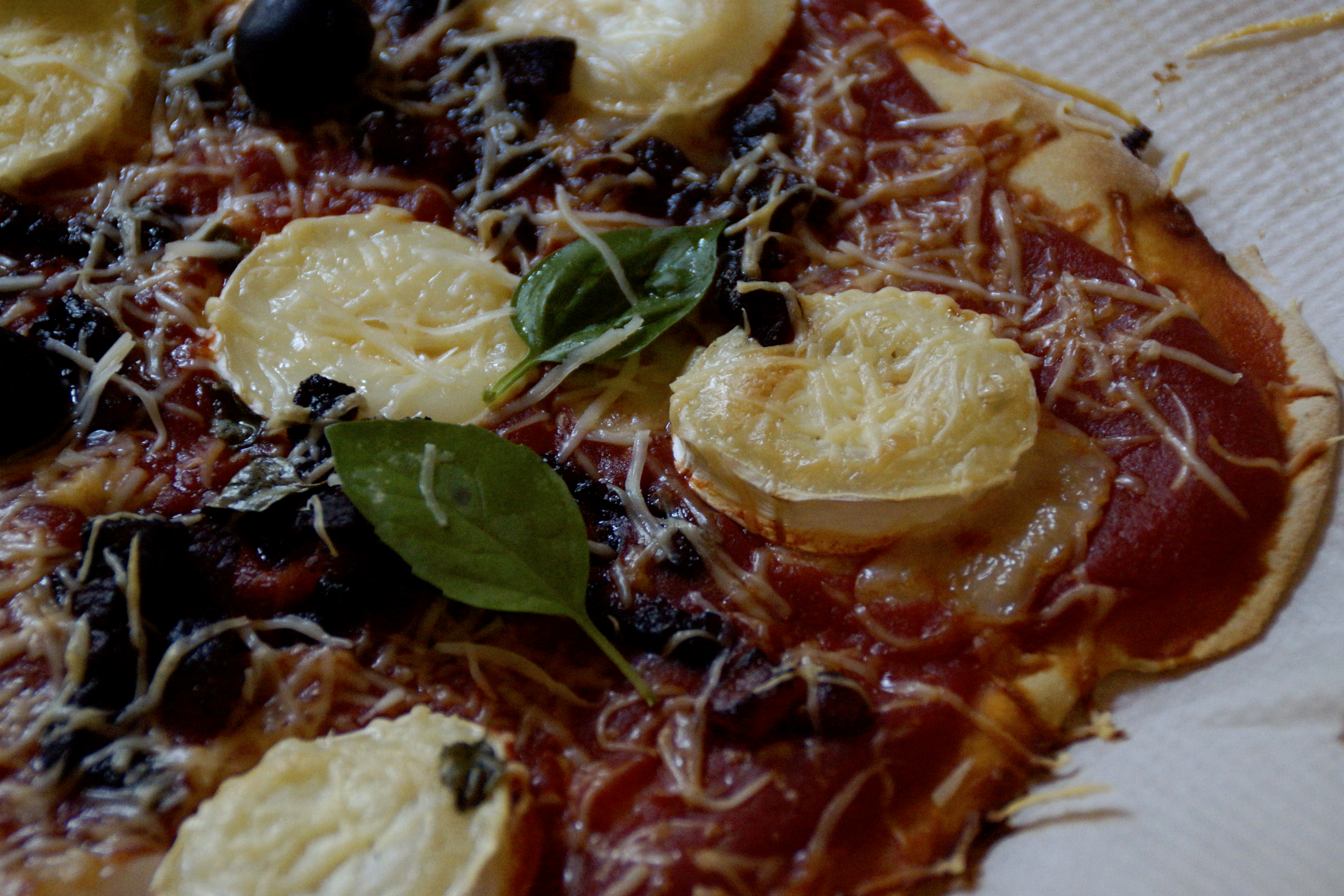 Etalez bien votre pâte et garnissez-la de Tomacouli, parsemez d’emmental râpé et ajoutez les lardons. Découpez quelques tranches de fromage de chèvre et placez-les où vous voulez, faites de même avec les lardons et les olives noires. Disposez deux ou trois feuilles de basilique et faites cuire pendant 15 à 20 minutes. Sortez du four et disposez deux ou trois autres feuilles de basilique. Et voilà!
