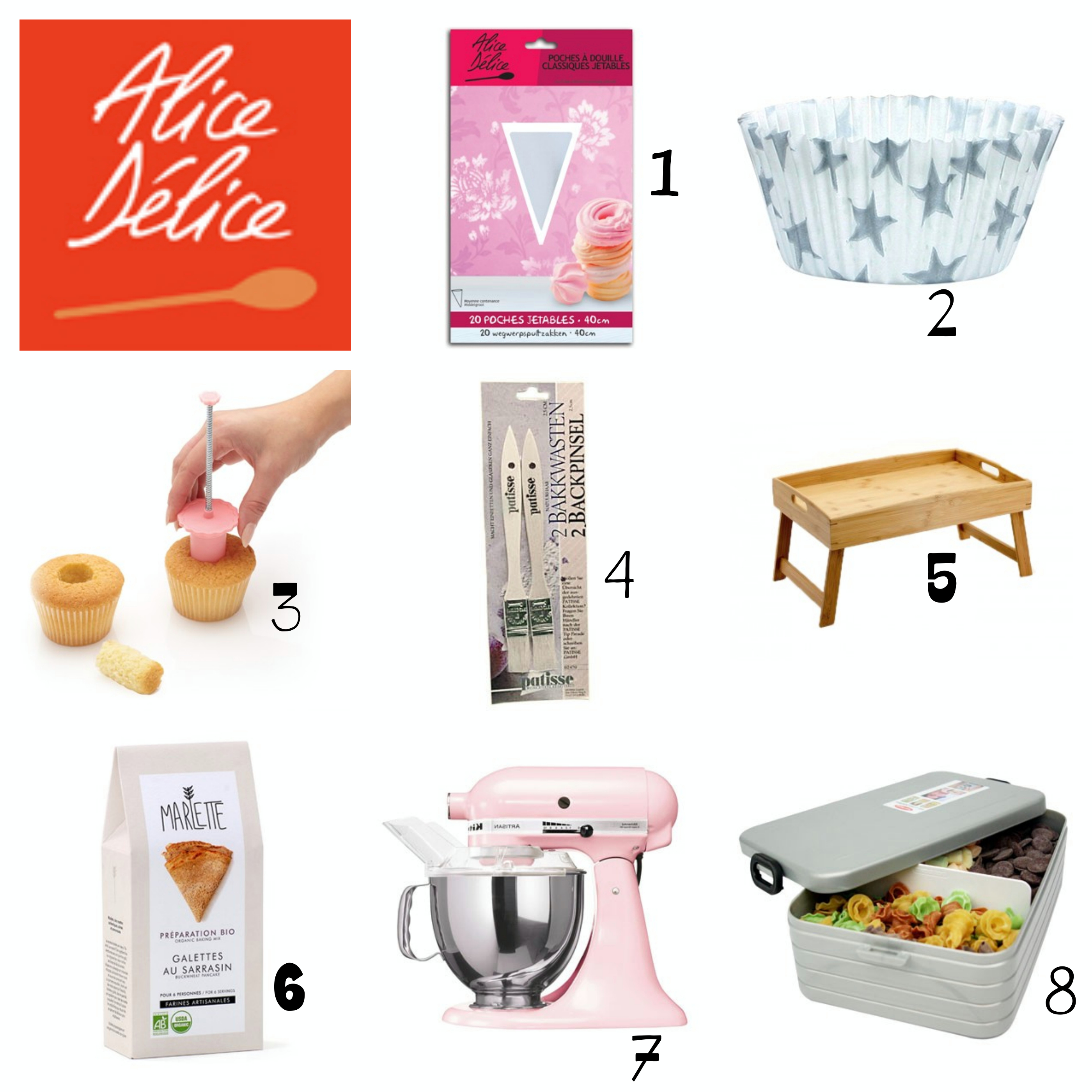 1. Poches à douilles jetables, plus que pratiques! 2. Caissettes pour cupcakes, j’adore en avoir de différentes sortes sous la mains et celles-ci sont ultra mignonnes avec leurs étoiles! 3. Evidoire à cupcake, pour y cacher… de la pâte à tartiner (ou autre) ;) 4. Pinceaux en bois, quelque chose qui me manque vraiment! 5. Plateau de lit en bambou… 6. Préparation Mariette pour galettes au sarrasin, parce que je n’ai jamais testé Mariette! 7. Robot Kitchen Aid, le rêve absolu! 8. Lunch Box, toujours utile cette petite chose.