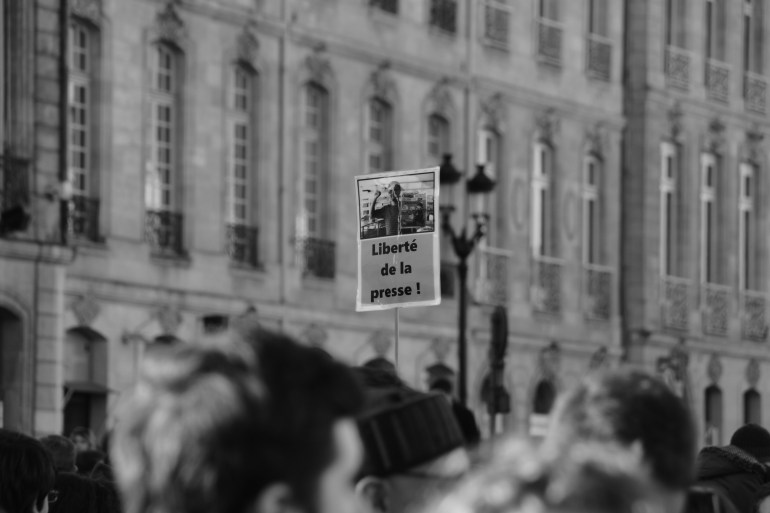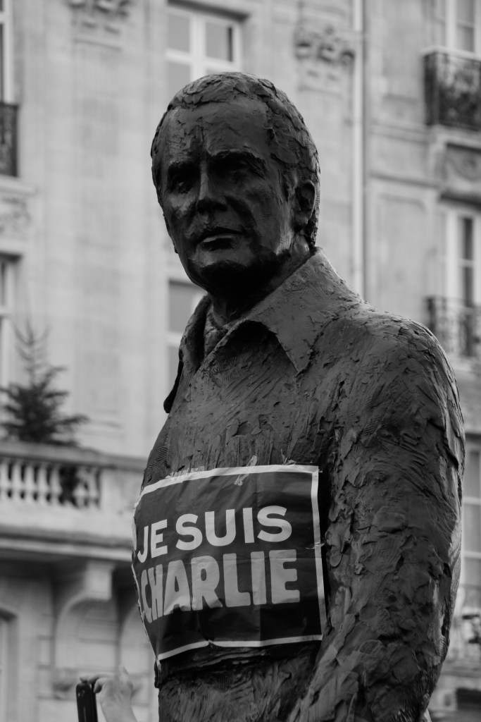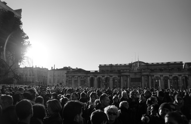 Hello les amis! J’espère que malgré les derniers jours que nous avons passé vous allez bien. Personnellement, je n’ai pas réussi à poster, je n’avais pas envie et je sais que beaucoup n’avais rien envie de lire non plus. J’ai eu tellement peur quand j’ai allumé ma télévision… Puis je me suis reprise, grâce à l’élan de courage de ces gens, de mon pays, je trouvais ça faible et indigne de ne pas relever la tête. Aujourd’hui avec Monsieur nous nous sommes rendus à la Marche de Bordeaux et j’ai pris tout un tas de photos. Aucunes en couleurs. Je ne m’imaginais pas faire ces photos en couleurs, le noir et blanc me semblait plus approprié, et reflétant plus l’humeur dans laquelle nous étions. Quand je les regarde je suis fière de Nous, car nous avons pu tous nous relever et nous sommes unis. Je nous sens plus forts que jamais; et pour Charlie, pour les policiers, pour ces innocents, toutes ces victimes j’espère que nous saurons le rester longtemps.