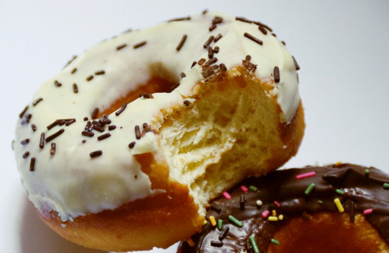 Pour la cuisson: dans une casserole ou la friteuse, faites chauffer l’huile à 175°C. Plongez les beignets dans l’huile chaude et lorsqu’ils remontent à la surface, tournez-les. Faites attention à eux afin de les cuire uniformément des deux côtés. Il ne vous reste plus qu’à les décorer! Vous pouvez opter pour le glaçage, mais j’ai préféré faire tout bête: au bain-marie (au micro-onde ça marche aussi), j’ai fait fondre 100g de chocolat blanc dans une assiette creuse puis 100g de chocolat noir dans une autre. Lorsque mes donuts sortent de la friteuse, je leur ai laissé quelques secondes pour ne plus me brûler les mains puis je les ai plongés dans le chocolat blanc ou noir et saupoudrés de vermicelles pâtissiers.