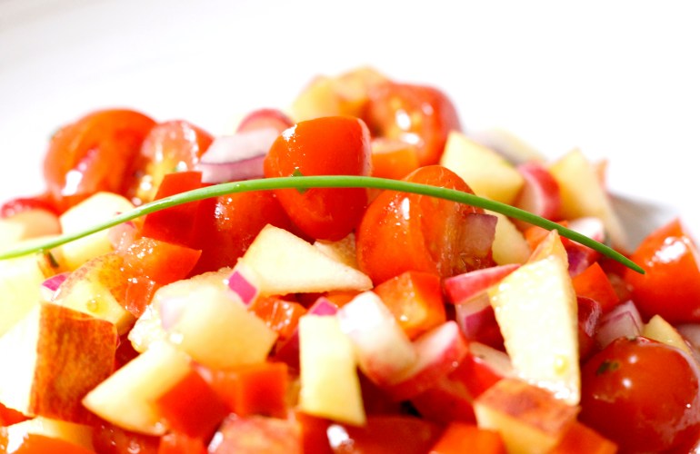 Il vous faut: des radis, des tomates cerises, un poivron rouge, une pomme rouge, un oignon rouge. Et pour changer un peu, une vinaigrette composée d’huile d’olive, de vinaigre balsamique, de miel et de ciboulette.