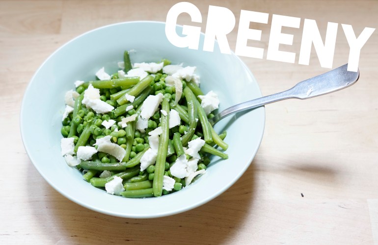 Des haricots verts, des petits pois pour les légumes et de la fêta + des copeaux de parmesan ou de cheddar pour le fromage.