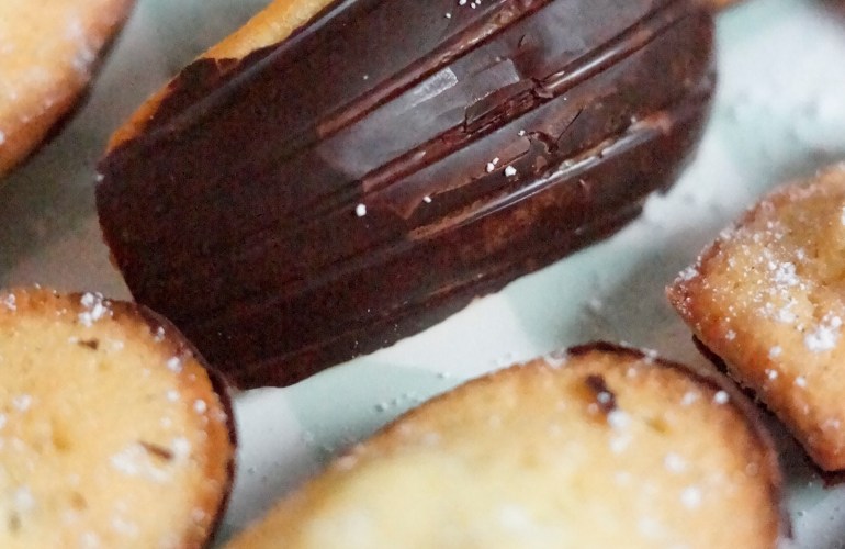 Pour environ 16 madeleines: 3 oeufs, 100g de sucre semoule, 110g de farine de blé, 1 gousse de vanille, 3gr de levure, 90gr de beurre salé. Pour le dessous au chocolat: 50g de chocolat noir, j’ai utilisé le chocolat noir Bonnat reçu dans La Bonne Box (voir l’article). Il est bon mais très amer, il faut aimer ^^