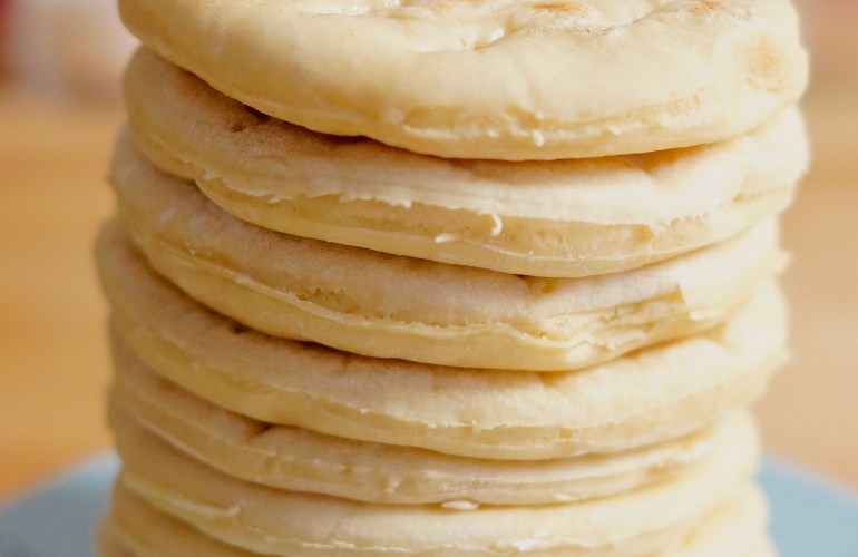 Faites chauffer une poêle sans matière grasse et déposez un cercle dedans, face trouée en dessous. Piquez la face non trouée et laissez cuire jusqu’à ce qu’il se colore. Retournez le pain et attendez un peu qu’il se colore. Faites de même pour tous les pains.