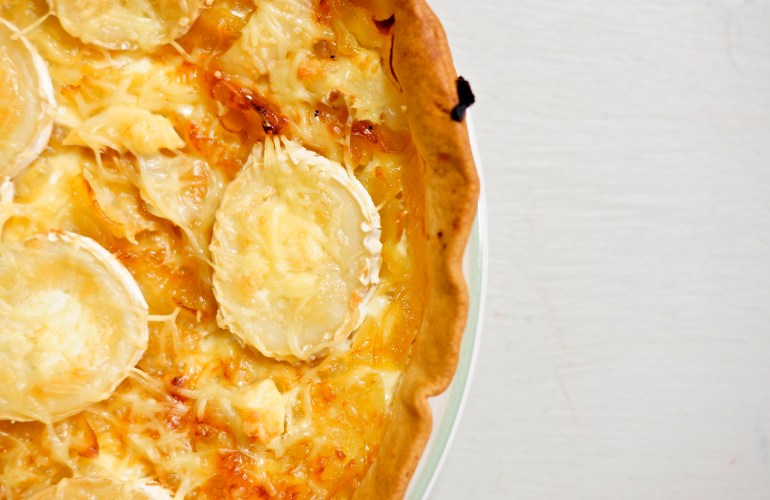 Sortez votre pâte du réfrigérateur et versez la crème fraîche dessus, déposez les oignons. Tranchez votre 1/2 buche de chèvre en rondelles et disposez-les sur les oignons. Parsemez de fromage râpé (emmental, parmesan…). Enfournez pour 30 minutes environ, surveillez car 25 minutes suffiront peut être.