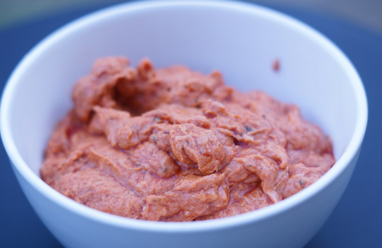 - remplacer les 5 cuillères à café de Tomacouli par 5 cuillères à café de poivronnade à tartiner. J’ai utilisé celle reçue dans La Bonne Box de ce mois-ci (l’article) qui contient des poivrons et des aubergines. Cet ingrédient se marie très bien avec le chorizo, il n’y a plus qu’à crier « Olé caliente » et vous êtes en vacances au bord de la Méditerranée.
