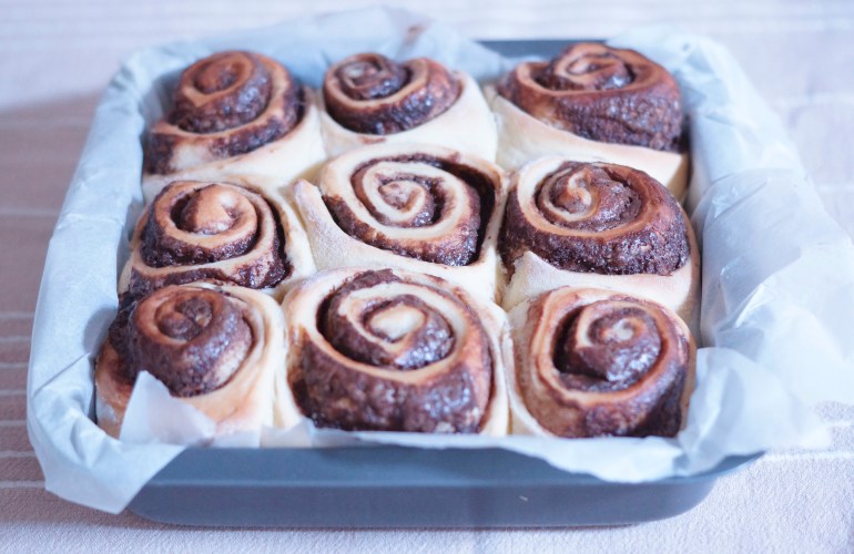Farinez votre plan de travail et quand votre pâte a doublé de volume, posez-la dessus. Dégazez en mettant la paume de votre main dessus puis étalez-la à l’aide de votre rouleau à pâtisserie en un rectangle d’environ 45x35cm. Répartissez la crème fraiche puis la pâte à tartiner uniformément sur le rectangle de pâte. Enroulez la pâte sur elle même dans le sens de la longueur. Serrez bien, pour avoir de jolis rolls après. A l’aide d’un couteau bien tranchant, découpez 9 tranches égales. Placez ces tranches dans un moule carré recouvert de papier sulfurisé (un moule à brownie, c’est top). Laissez à nouveau pousser 1h00 sous un torchon à côté d’une source de chaleur (quand il fait 30° dehors, n’allumez pas votre radiateur, ça va aller).