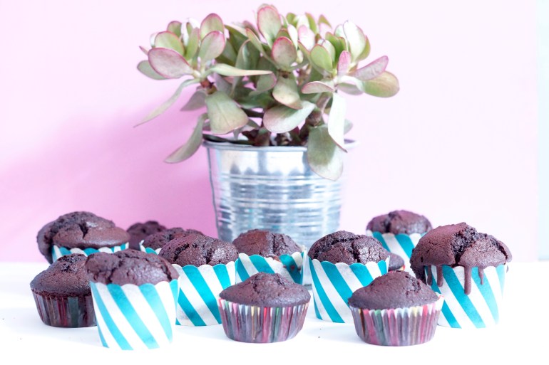 Chemisez votre moule à muffins avec de jolies caissettes et versez la pâte quasiment jusqu’au bord des moules. Oui, oui, on a pas peur, on ne s’arrête pas aux 3/4! Enfournez et laissez cuire 25 à 30 minutes. Attendez 5 minutes avant de les sortir du moule et régalez-vous.