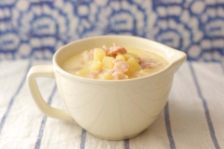 Pour 4: 20g de beurre, 275g de lard (j’utilise du bacon entrelardé car ici je n’ai toujours pas trouvé de lardons nature, à vous de choisir), 1 oignon, 500g de pommes de terre, 250ml d’eau chaude, 450ml de lait.