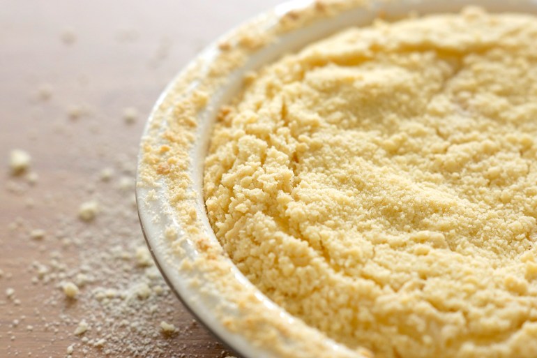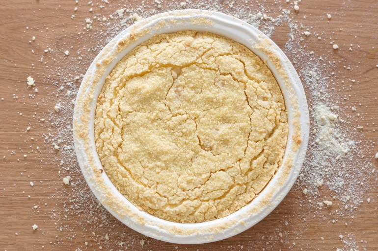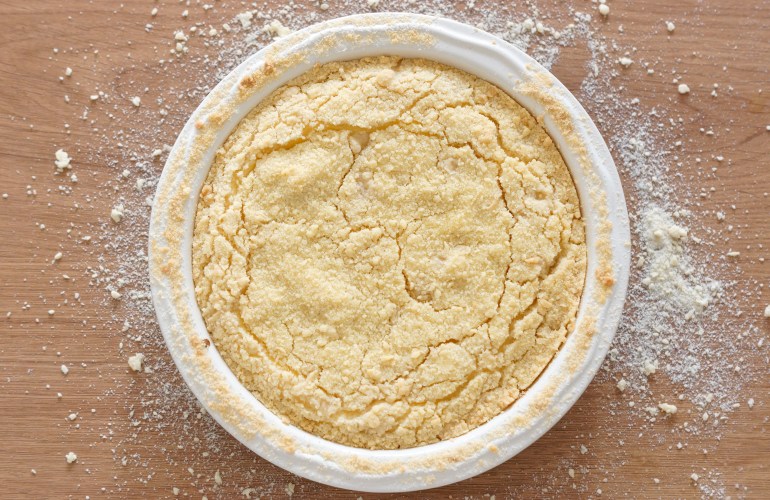 Faites le crumble. Dans un saladier, mettez la farine avec le sucre et le beurre. Il vous suffit de mélanger du bout de vos petits doigts afin de faire un crumble, comme du sable. Emiettez ce mélange sur votre crème au citron, faites le en douceur pour que les deux ne se mélangent pas. Placez au four et laissez cuire 35mn.