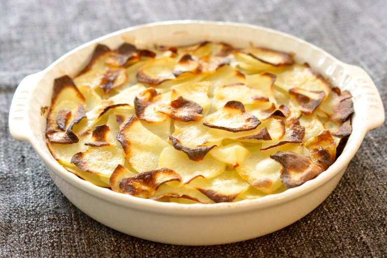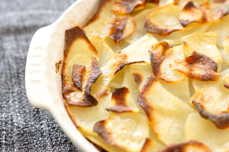Une fois les 15mn passées, assaisonnez vos poireaux et boeuf haché et mettez dans votre plat. Déposez les rondelles de pommes de terre dessus, vous aurez probablement plusieurs couches. Coupez les 10g de beurre restants en petits dés et dispersez-les sur les pommes de terre. Faites cuire 40 à 45mn. J’aime bien que les pommes de terre croustillent un peu c’est pourquoi je les ai laisser se colorer un peu mais si vous ne voulez pas que cela arrive, surveillez bien et dès qu’elles commencent à dorer il vous suffit de couvrir le plat avec du papier aluminium et de le remettre à cuire. Laissez reposer un peu avant de manger ou vous risquerez de vous bruler.