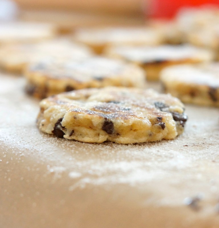 Parlons de la recette en elle-même. Les welsh cakes traditionnels sont avec des raisins secs mais je n’ai vraiment pas une grande affinité pour ces trucs fripés marrons alors j’ai décidé de les remplacer. Dans un premier temps je les ai remplacé par les zestes d’un citron et c’était bon, mais le Barbu m’a balancé à un gallois et si vous aviez vu le regard qu’il m’a lancé, vous auriez vous aussi compris que c’était une grosse bêtise! Un massacre! Une honte! Disgrace, trahison toussa toussa (peut-être pas… mais peut-être). J’avais pensé à remplacer les raisins par des pépites de chocolat car j’en avais déjà vu et après en avoir parlé, c’est beaucoup plus toléré que les zestes de citron alors voici la petite recette. Mes welsh cakes aux pépites de chocolat.