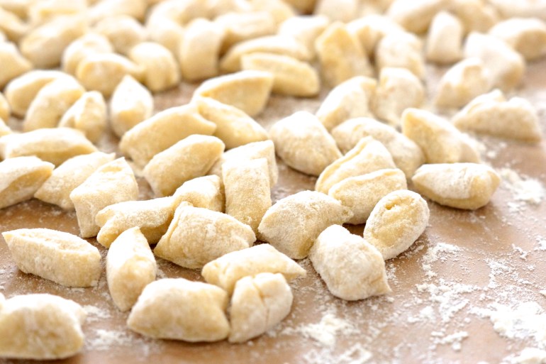 Divisez votre pâte en 8. Formez des boudins longs et fins. Comme vous pouvez le voir sur la photo, j’ai dû faire beaucoup plus de boudins car ils étaient trop longs donc il se peut que vous deviez faire de même. Farinez-les et coupez-les en petits bouts d’1cm. Vous avez des gnocchis! Il vous suffit maintenant de les écraser un peu avec une fourchette en les faisant rouler dans votre main et voilà!