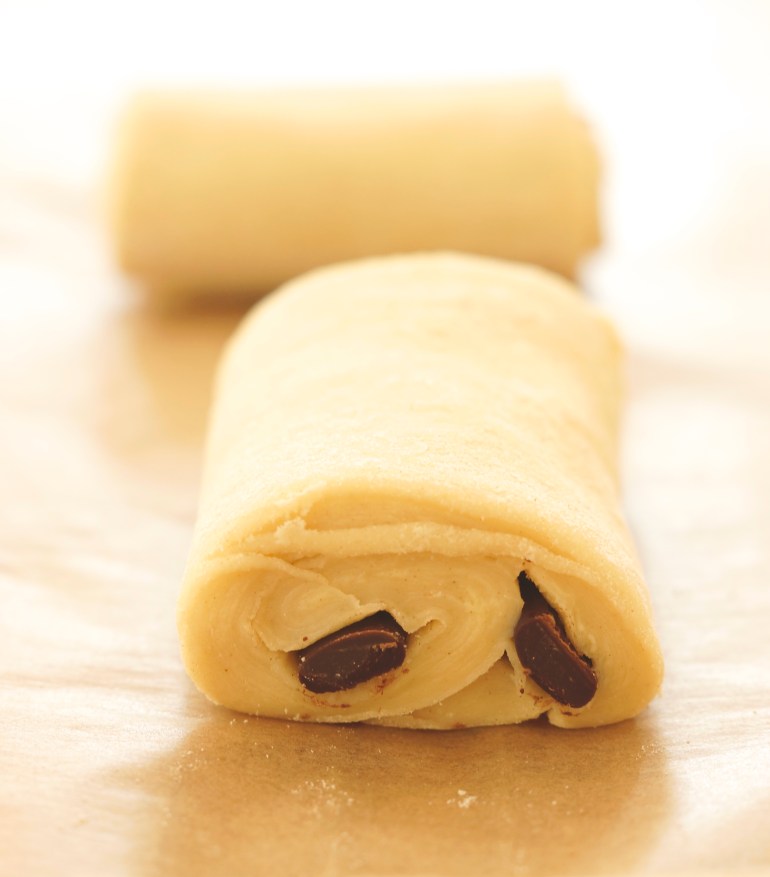 Roulez les rectangles de pâte en commençant par le bord de droite et en repliant la pâte sur la première barre de chocolat. Continuez de rouler jusqu’au bout, la soudure doit se retrouver dessous.