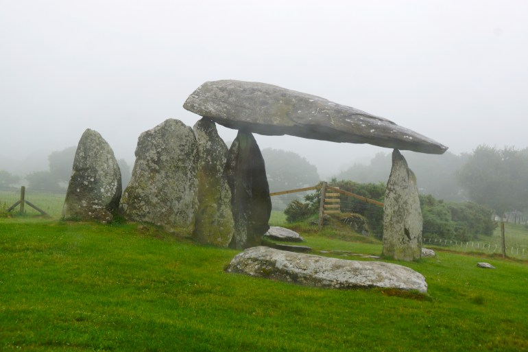 Dernier petit arrêt avant de rentrer à Cardiff: Pentre Ifan car nous voulions voir un peu du vieux. Cet endroit est niché sur une colline et en théorie, il y a une vue magnifique sur la campagne et la mer mais bon, brouillard oblige, on a vu des moutons! Pentre Ifan est une chambre funéraire qui date du néolithique (qui a donc 4500 ans) et qui est formée avec le plus gros dolmen du Pays de Galles, et devant la chose une question nous est venue « comment? comment ont-ils fait? ». Le caillou fait quand même 5m de long et pèse 16 tonnes et est posé sur 3 autres cailloux verticaux fait de la même pierre que celles de Stonehenge. C’est fou, j’ai beau y réfléchir je ne comprends pas par quelle magie ce truc tient depuis si longtemps. Ils étaient balaises quand même! Si quelqu’un a l’explication, je la prends vo-lon-tier.