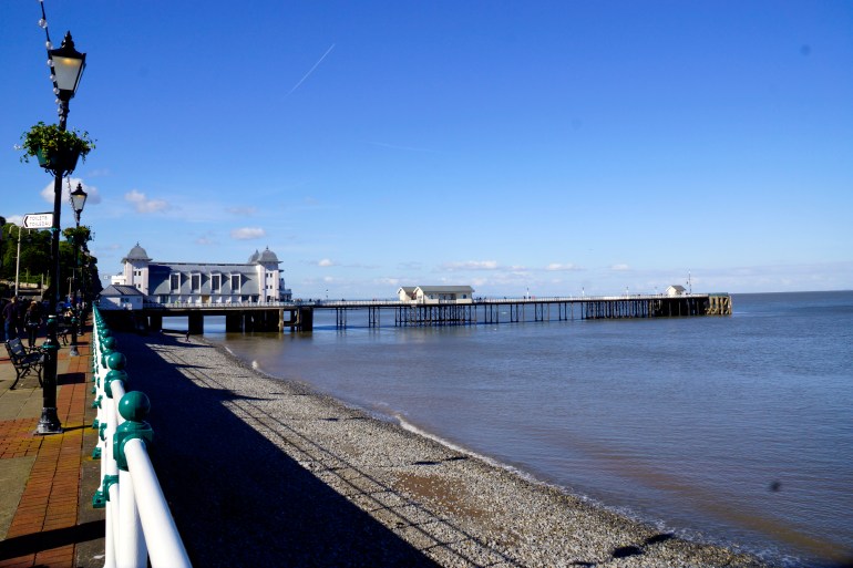 Direction Penarth donc. Penarth est située entre là où nous habitons, Cardiff et là où je travaille, Barry. Nous y avions mis les pieds brièvement, lorsque nous avions traversé le barrage qui part de Cardiff Bay mais nous n’avions jamais été jusqu’à la jetée alors qu’elle est très connue. Nous nous sommes garés en haut d’une petite côte et nous sommes descendus à pieds, vers la plage de cailloux.
